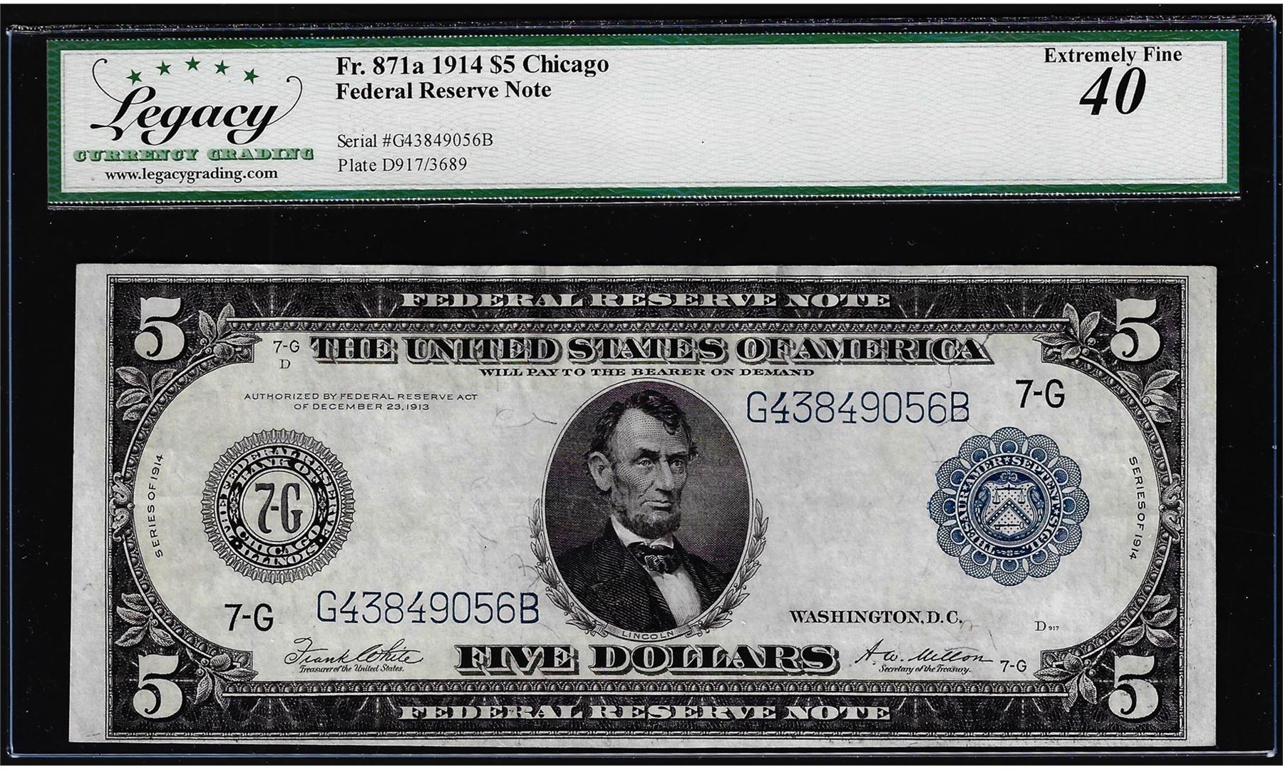 One 1914 $5 Federal Reserve Note Chicago Fr.871A Legacy Extremely Fine 40. Legacy Graded.