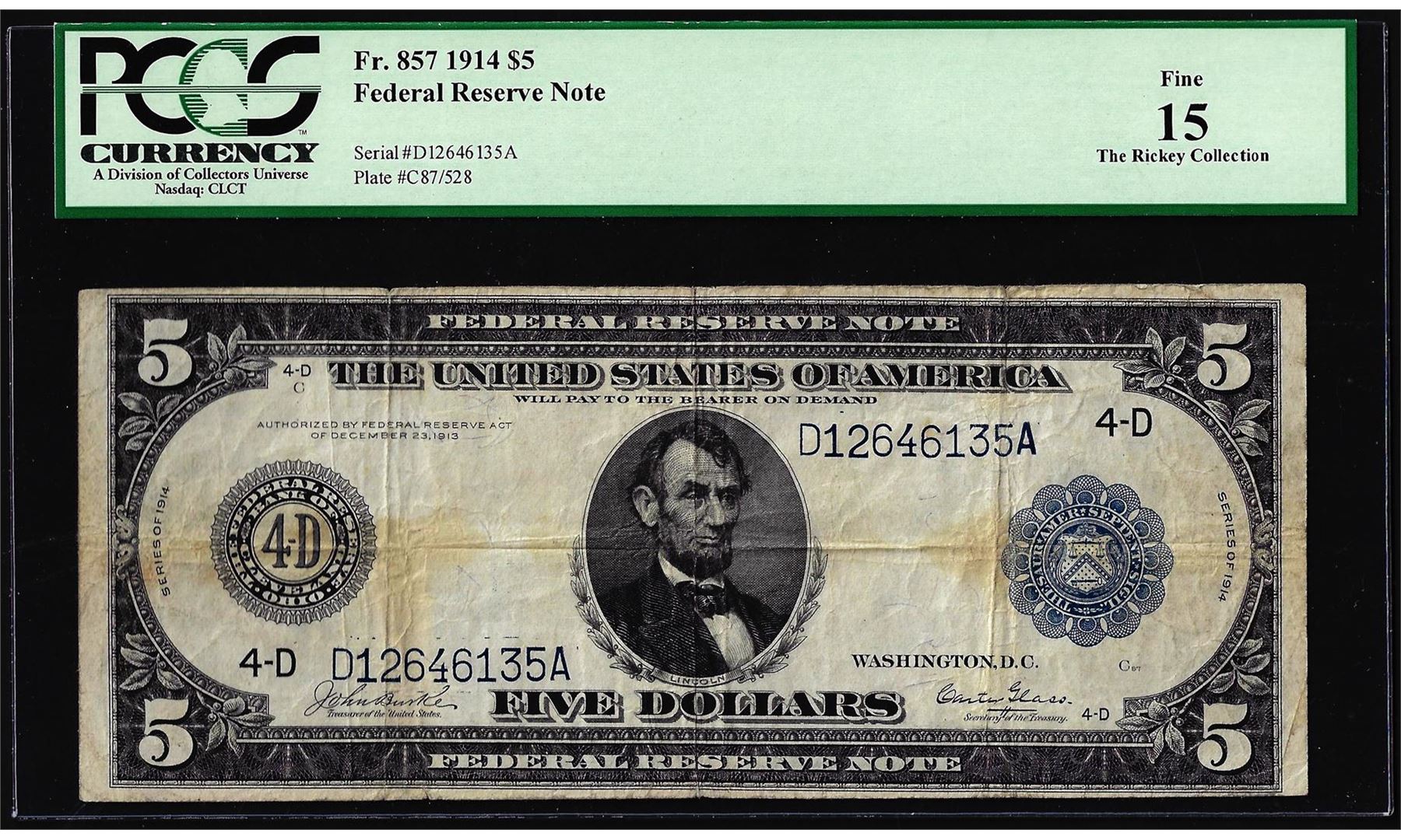 One 1914 $5 Federal Reserve Note Cleveland Fr.857 PCGS Fine 15. PCGS Graded.
