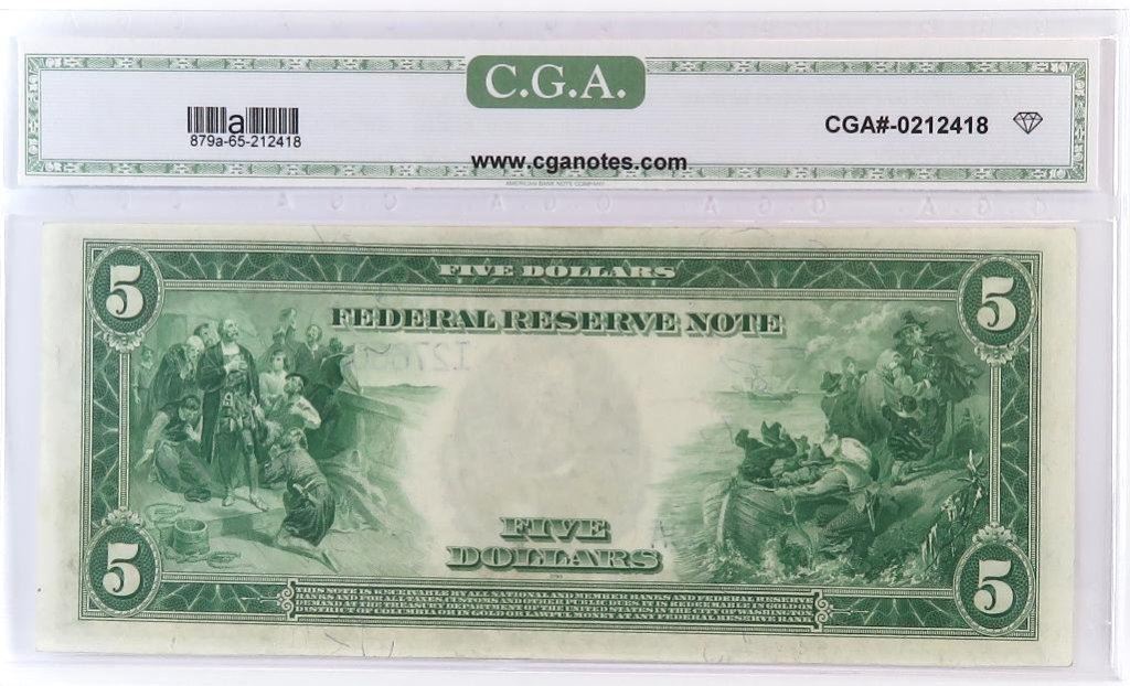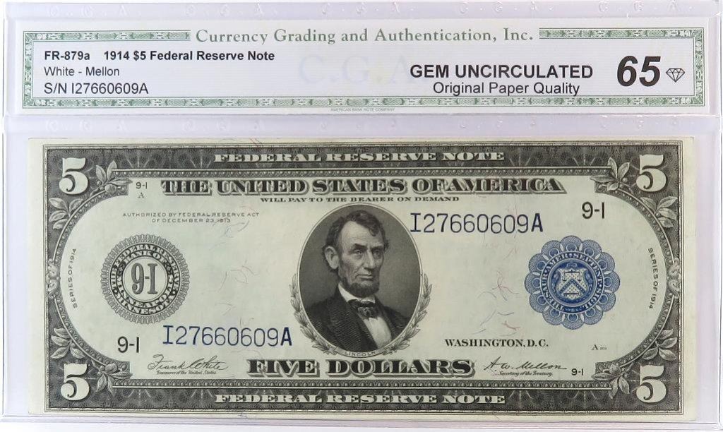 1914 $5 Federal Reserve Note. FR# 879a. CGA Certified GU65.