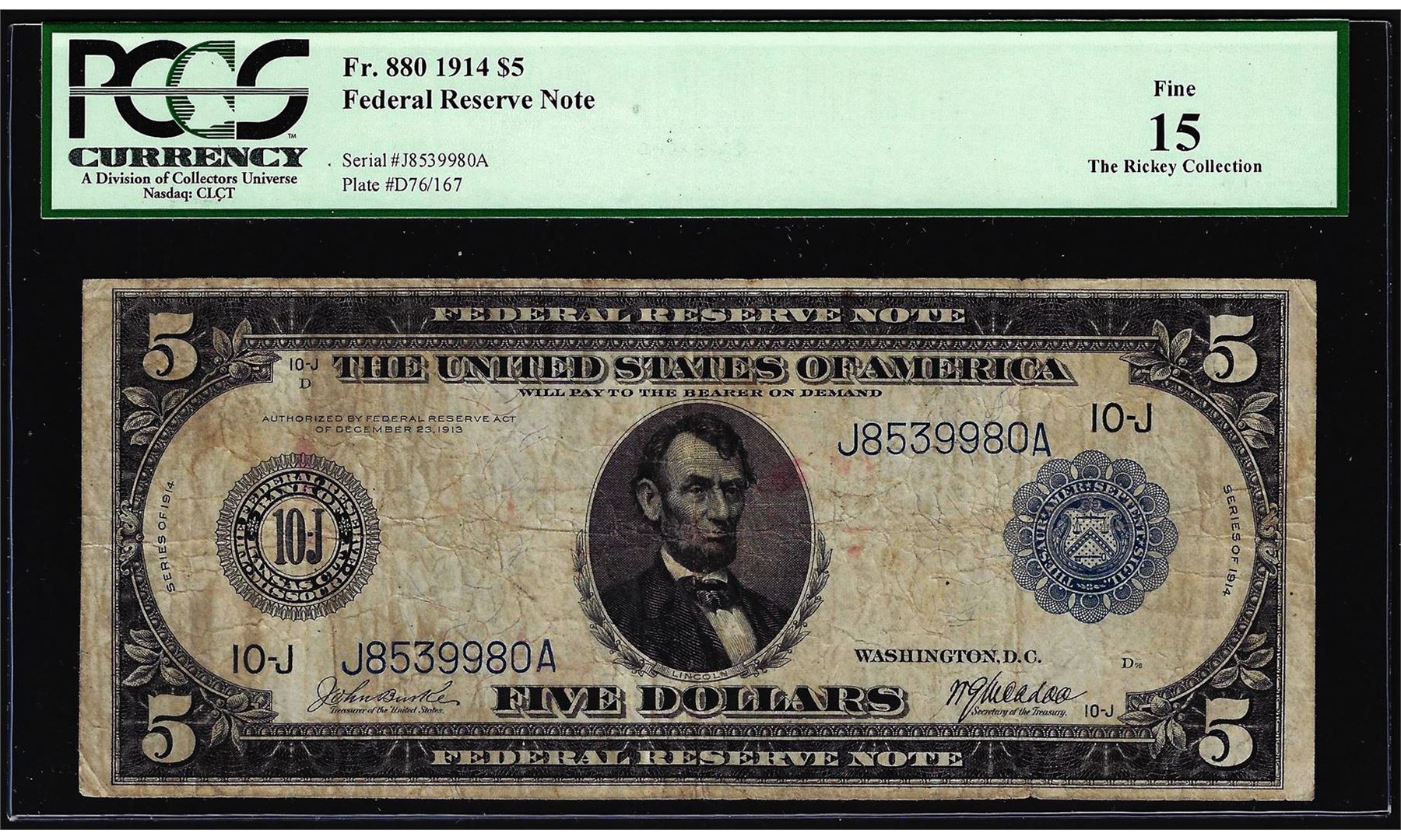 One 1914 $5 Federal Reserve Note Kansas City Fr.880 PCGS Fine 15. PCGS Graded.