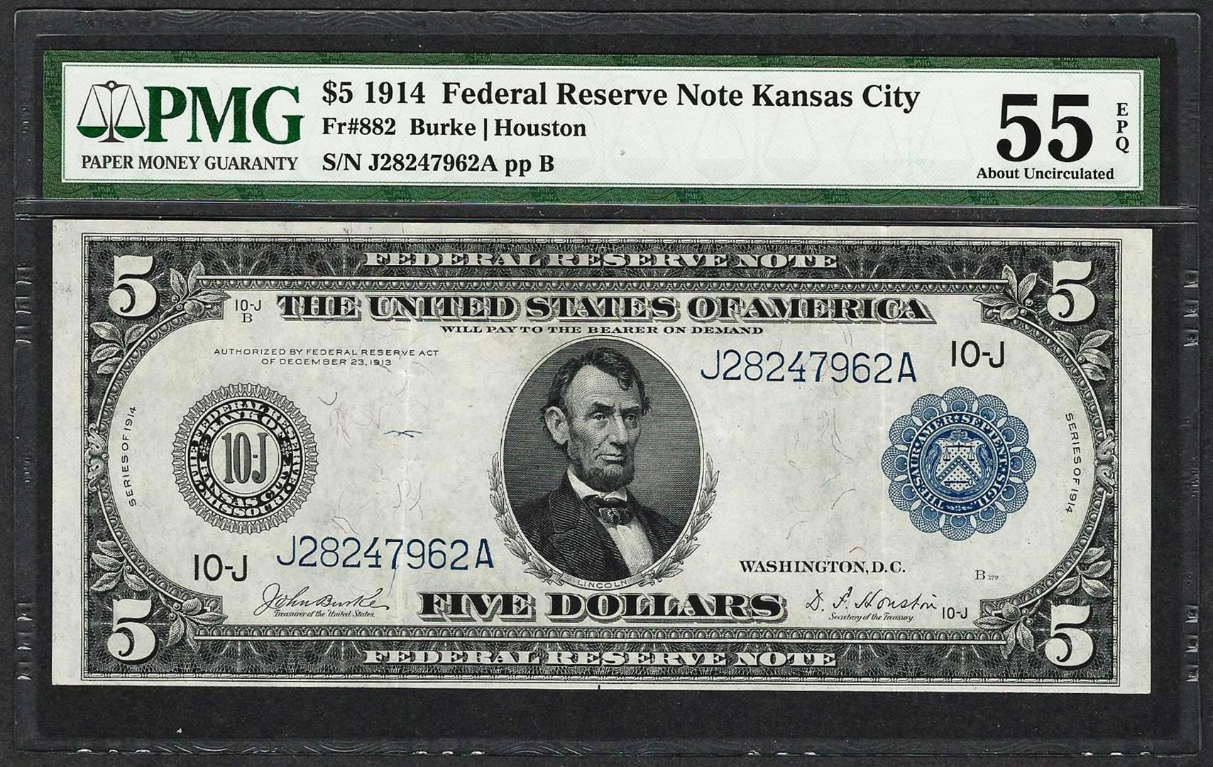 1914 $5 Federal Reserve Note Kansas City Fr.882 PMG About Uncirculated 55EPQ