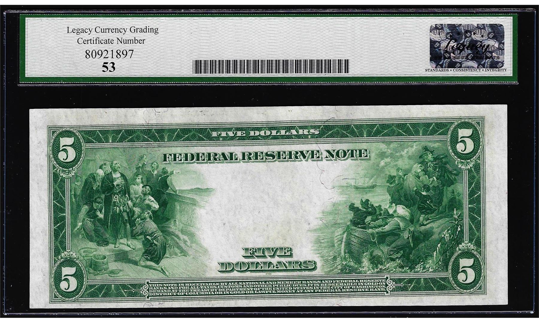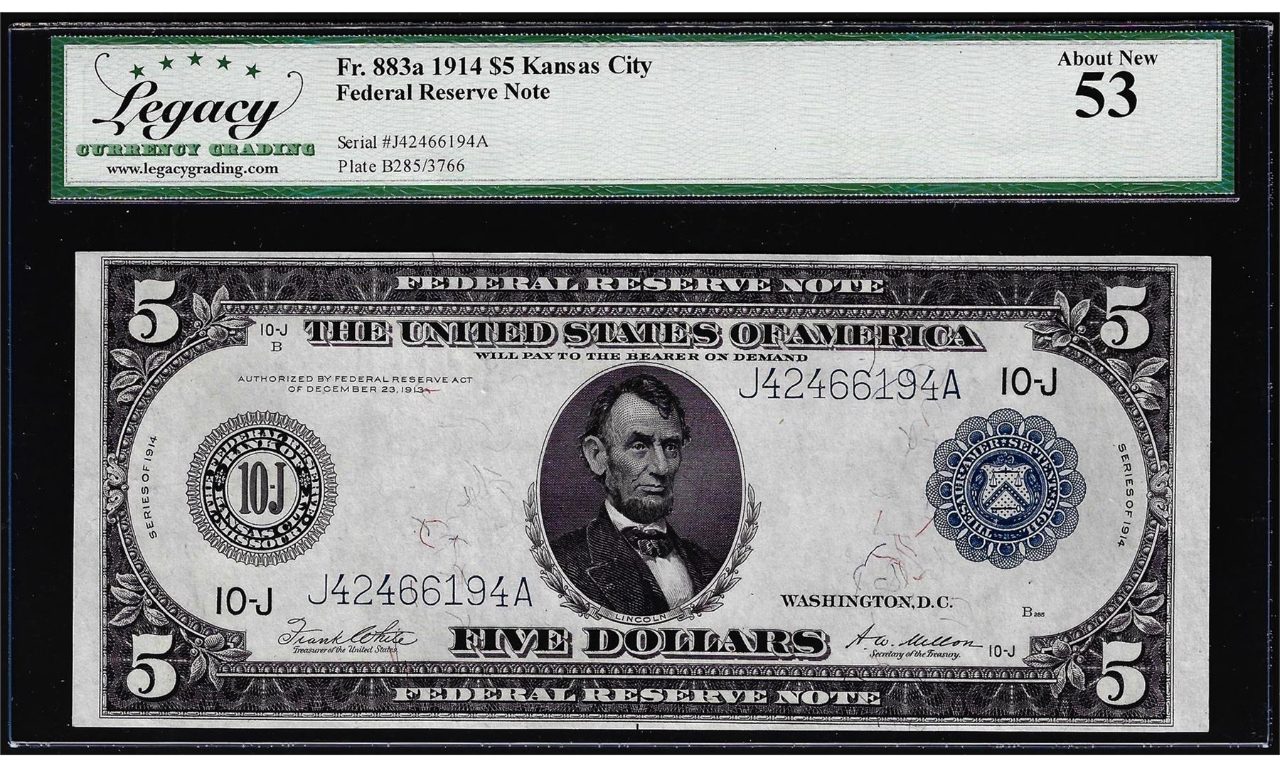 One 1914 $5 Federal Reserve Note Kansas City Fr.883a Legacy About New 53. Legacy Graded.