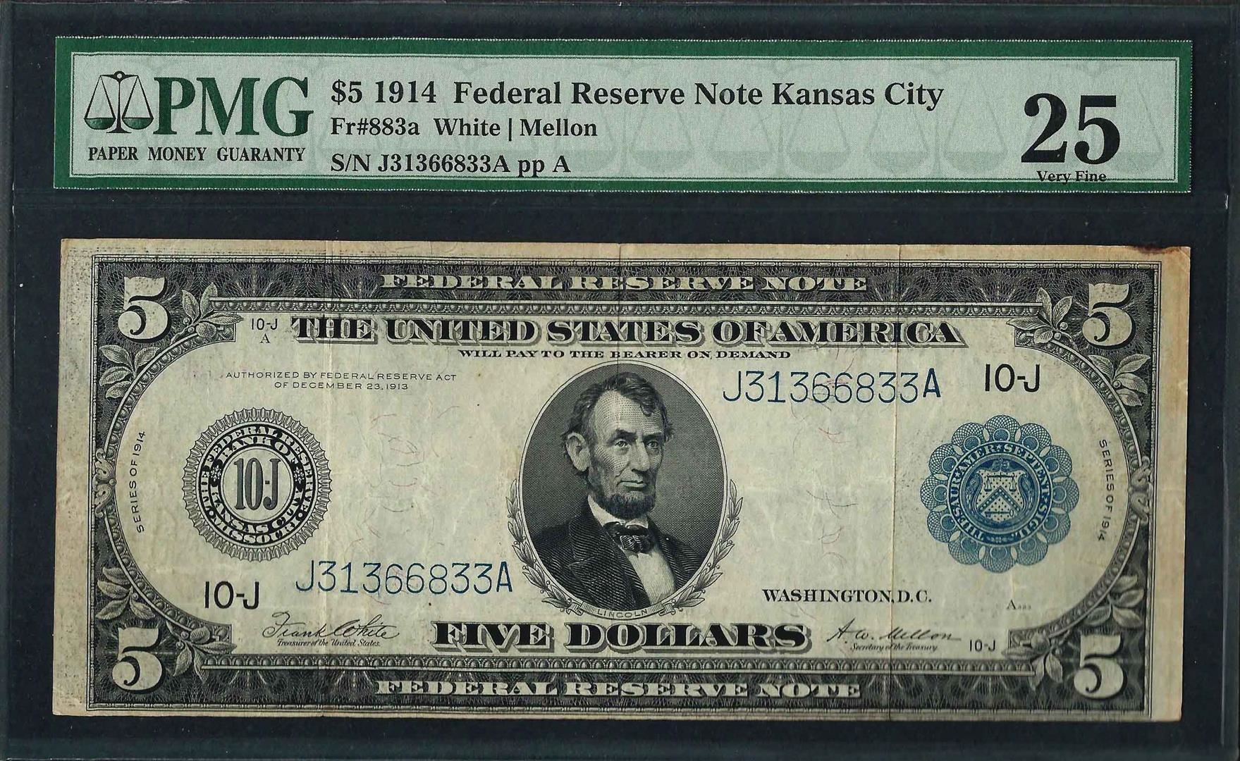 One 1914 $5 Federal Reserve Note Kansas City Fr.883a PMG Very Fine 25. PMG Certified.