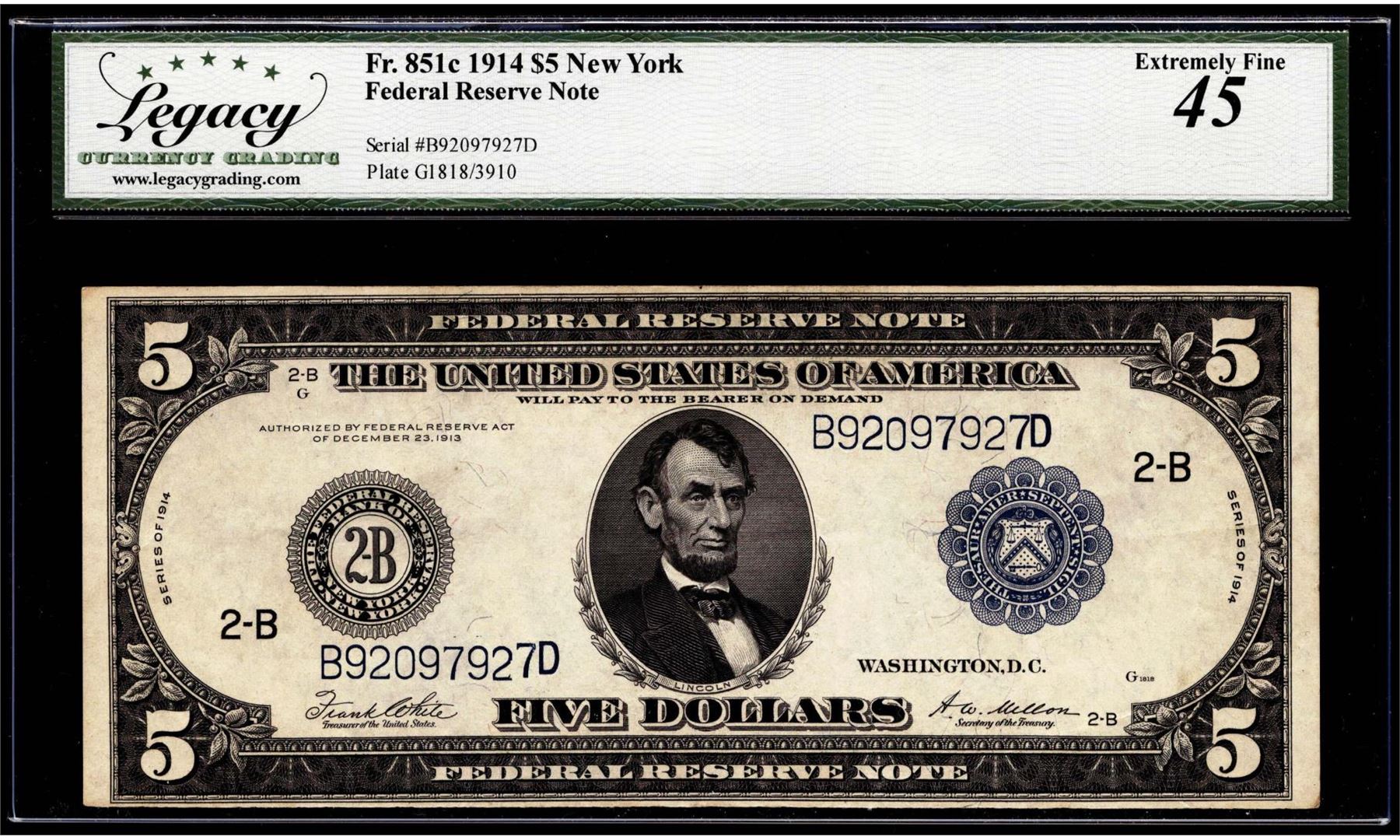 One 1914 $5 Federal Reserve Note New York Fr. 851C Legacy Extremely Fine 45. Legacy Graded.