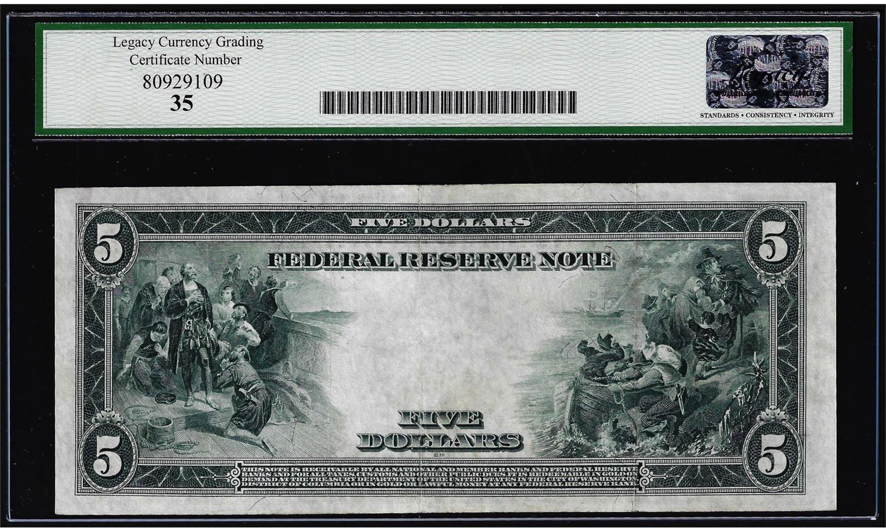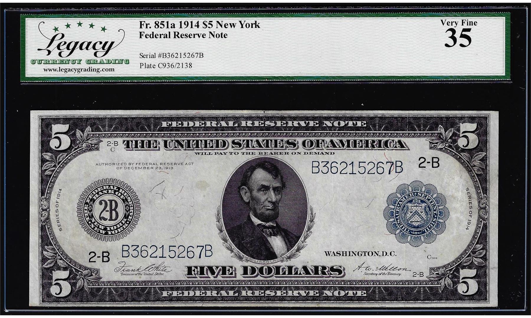 One 1914 $5 Federal Reserve Note New York Fr.851a Legacy Very Fine 35. Legacy Graded.