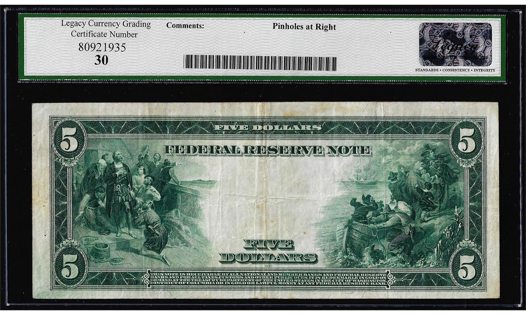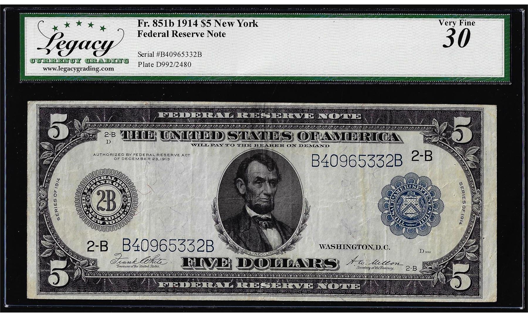 1914 $5 Federal Reserve Note New York Fr.851b Legacy Very Fine 30