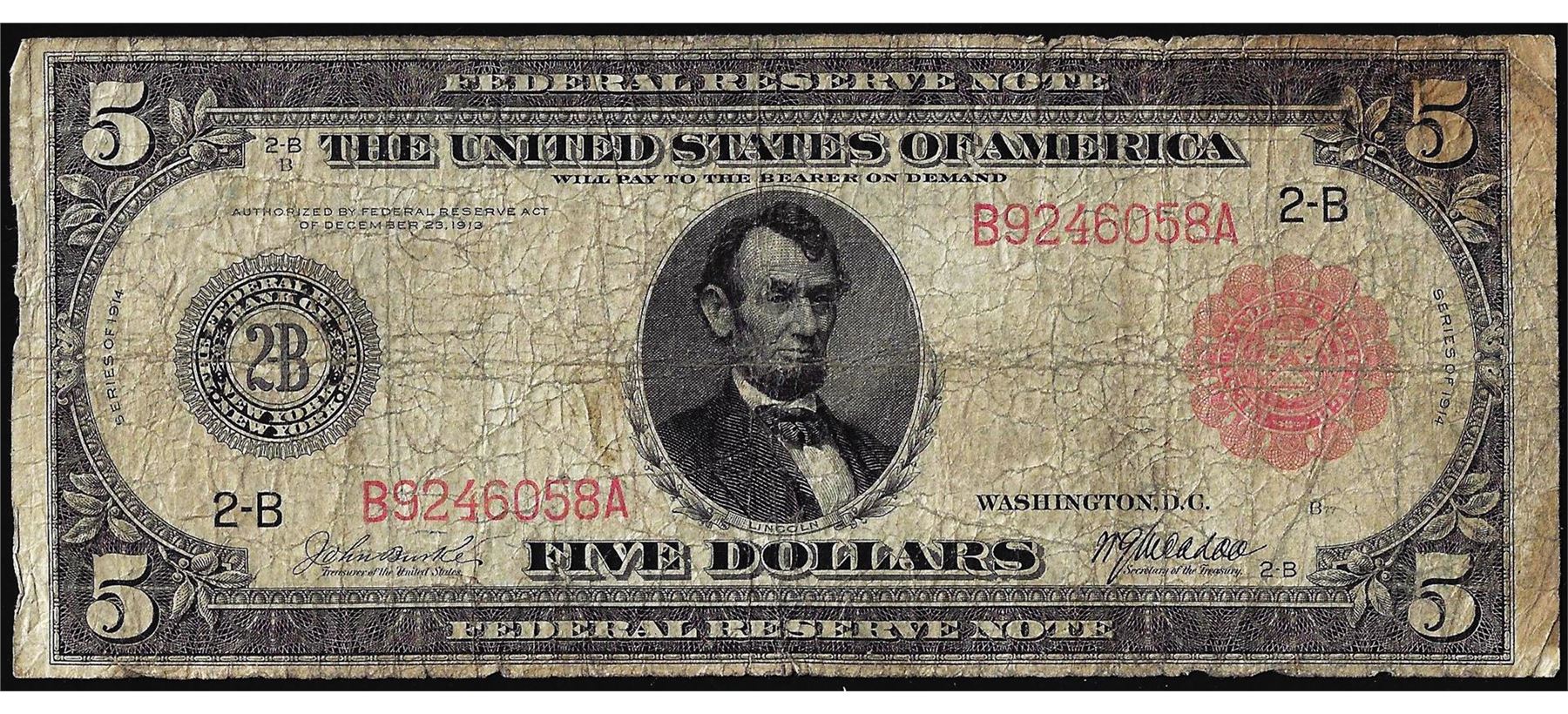 One 1914 $5 Federal Reserve Note New York Red Seal.