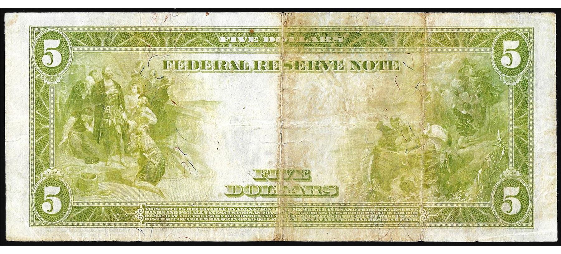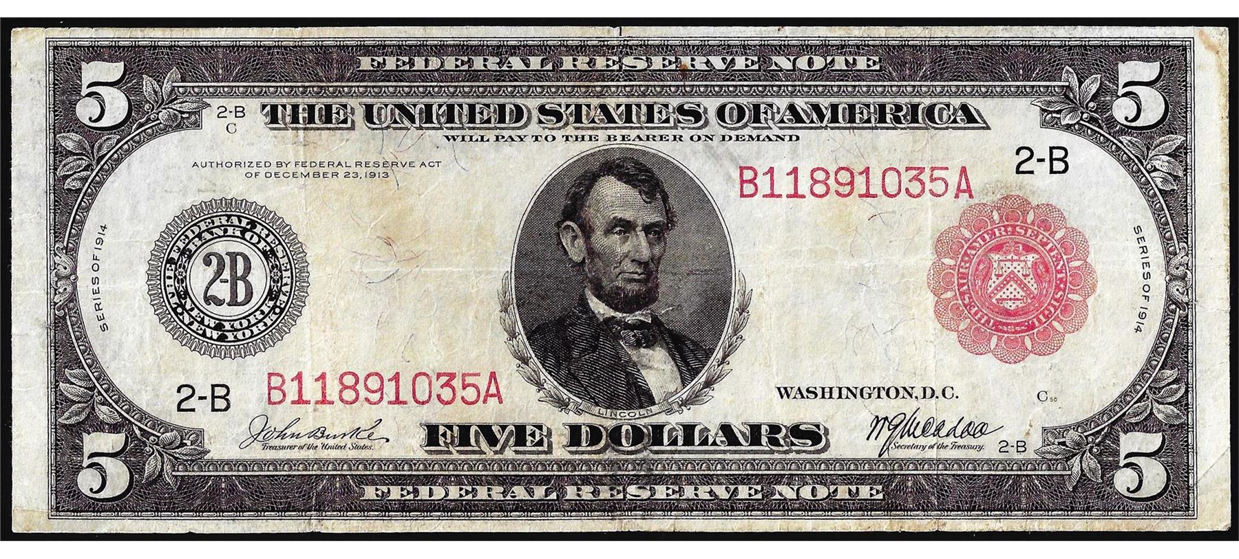 One 1914 $5 Federal Reserve Note New York Red Seal.