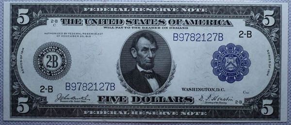 1914, 5 Federal Reserve Note, New York. S/N B9782127B pp C. Burke / Houston. Exceptional paper quality. PMG graded Gem Uncirculated 66 EPQ.