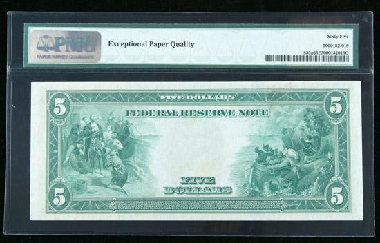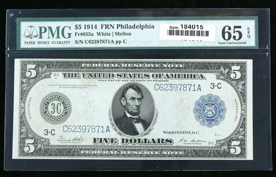 1914, $5 Federal Reserve Note. PMG Gem Uncirculated 65EPQ. . Fr-855a. This pretty Gem is from the Philadelphia district bank.