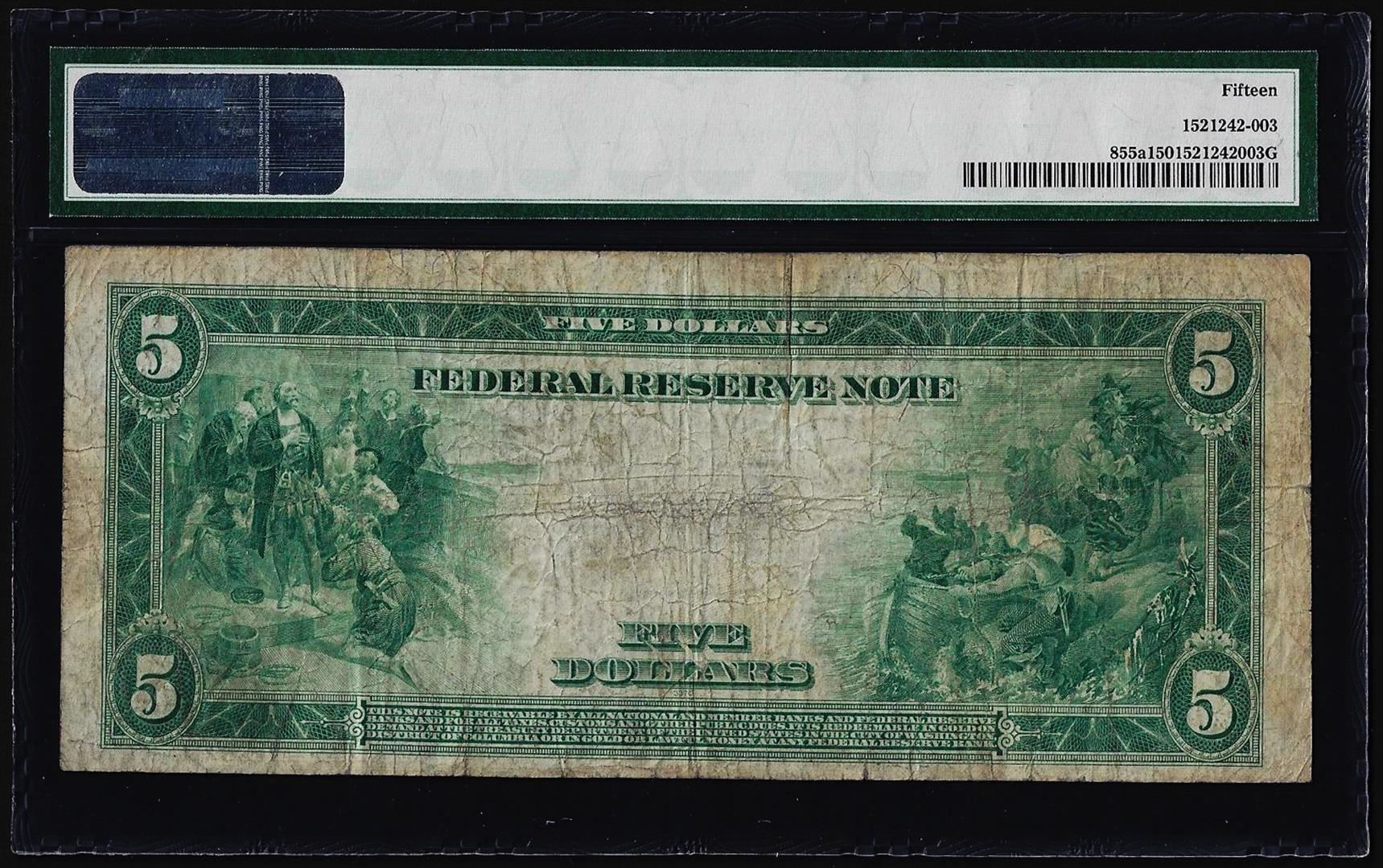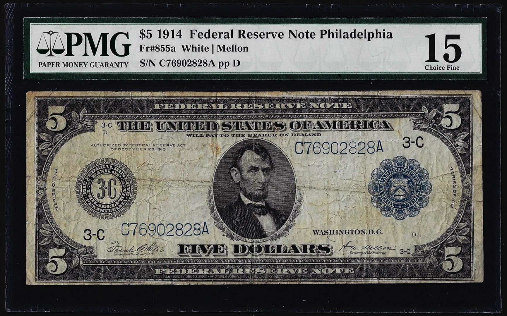 1914 $5 Federal Reserve Note Philadelphia Fr.855a PMG Choice Fine 15