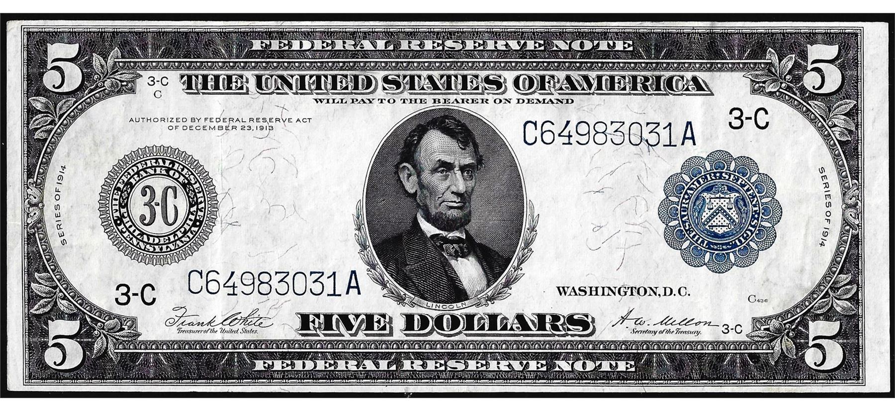 One 1914 $5 Federal Reserve Note Philadelphia.
