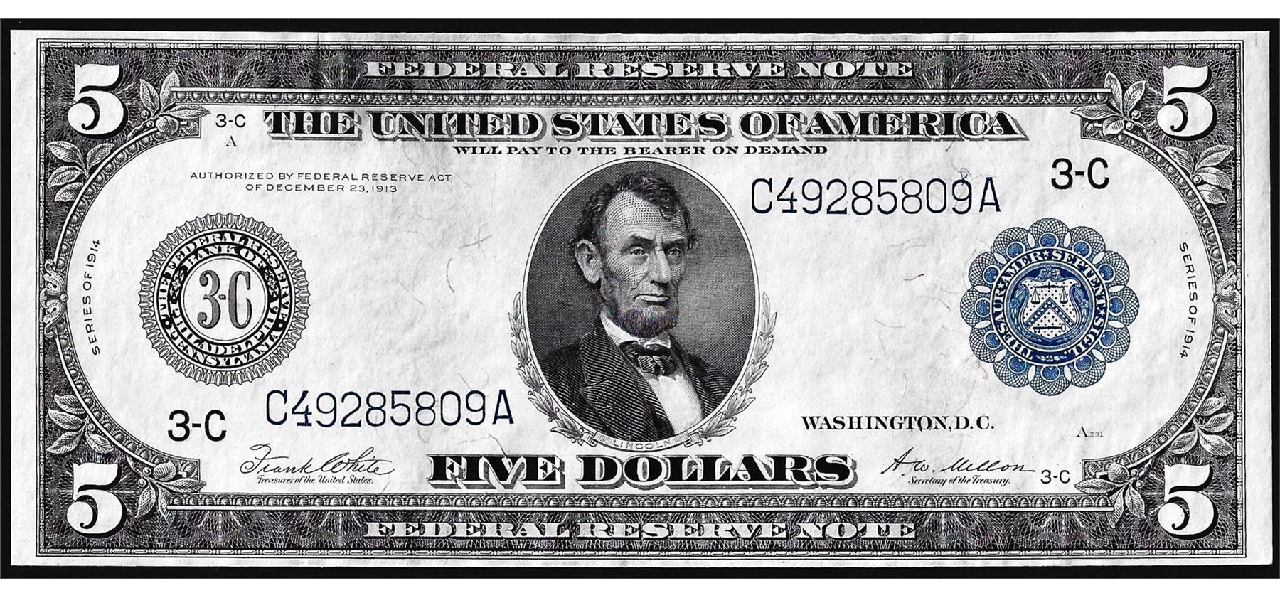 One 1914 $5 Federal Reserve Note Philadelphia.