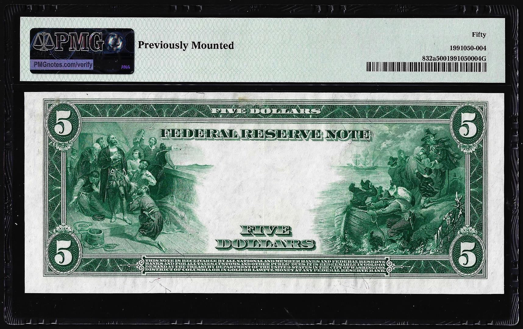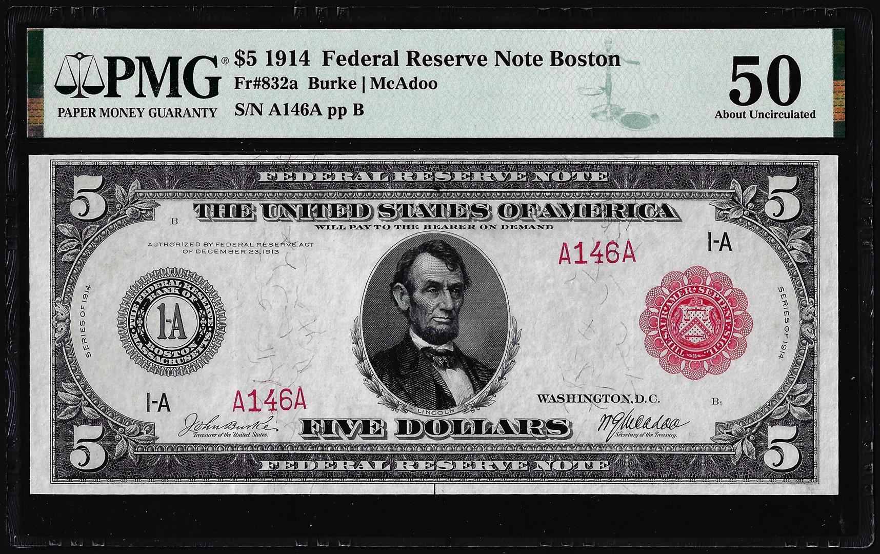 One 1914 $5 Federal Reserve Note Red Seal Boston Fr.832a PMG About Uncirculated 50. PMG Certified.