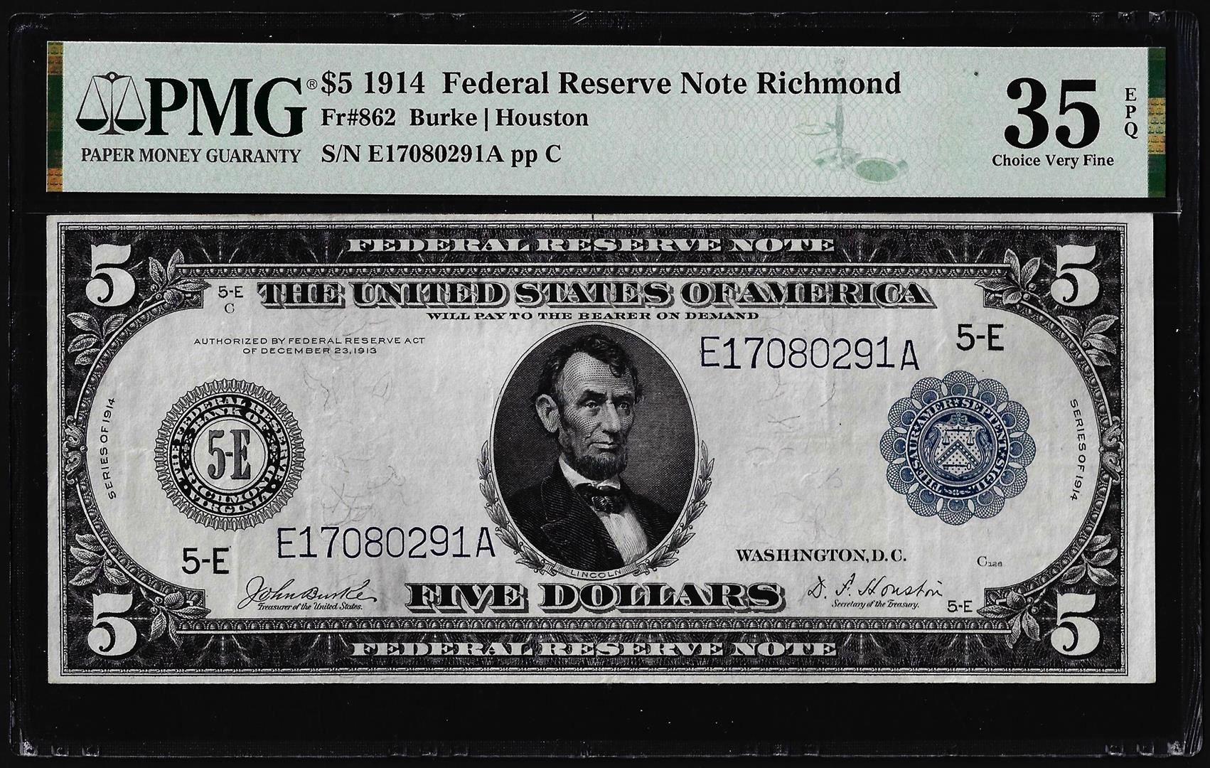 1914 $5 Federal Reserve Note Richmond Fr.862 PMG Choice Very Fine 35EPQ