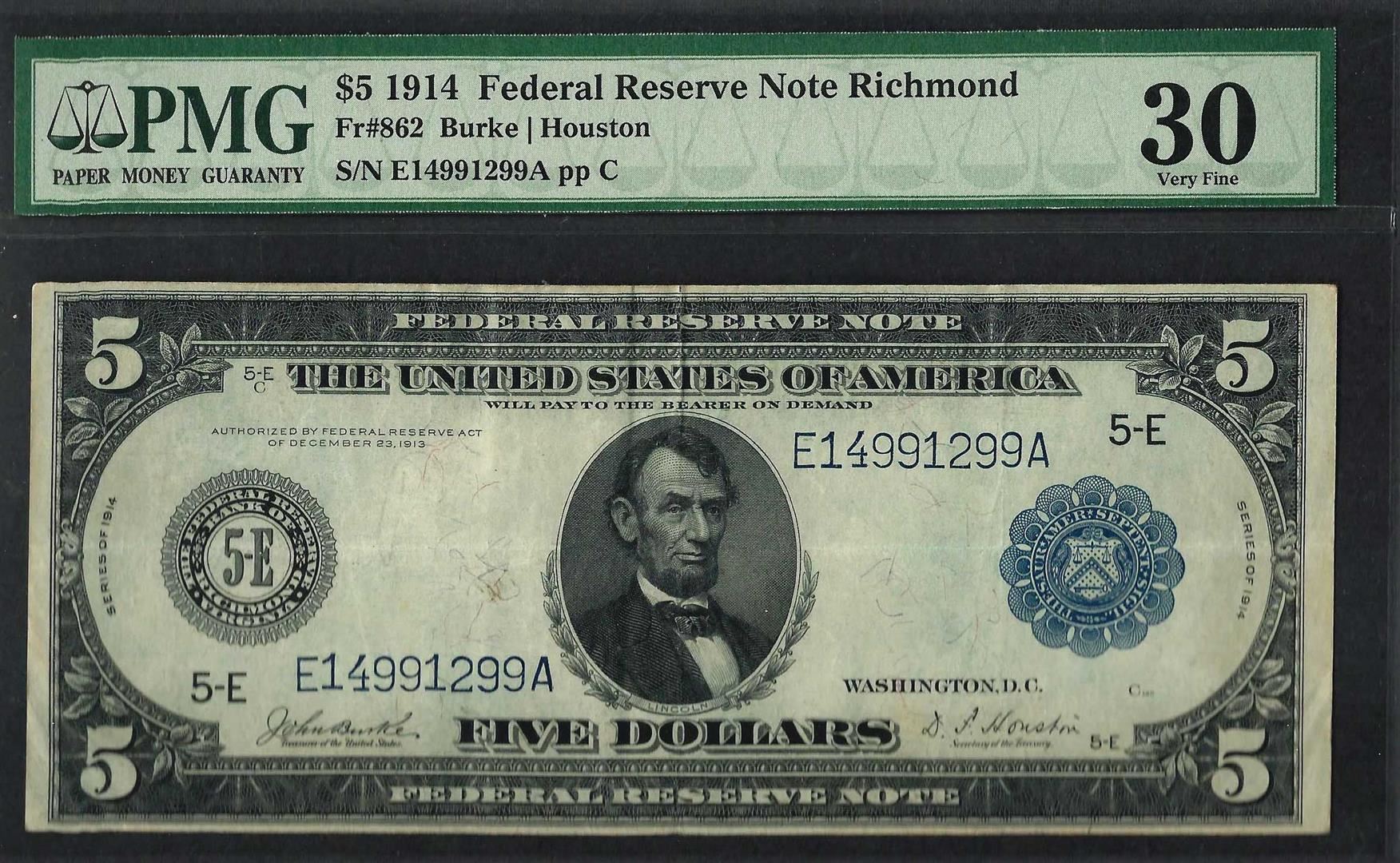 One 1914 $5 Federal Reserve Note Richmond Fr.862 PMG Very Fine 30. PMG Appraised.