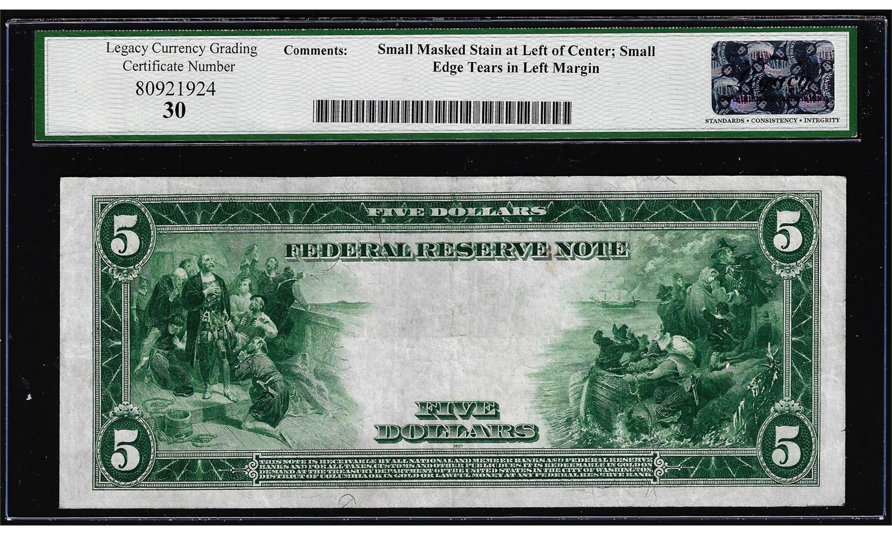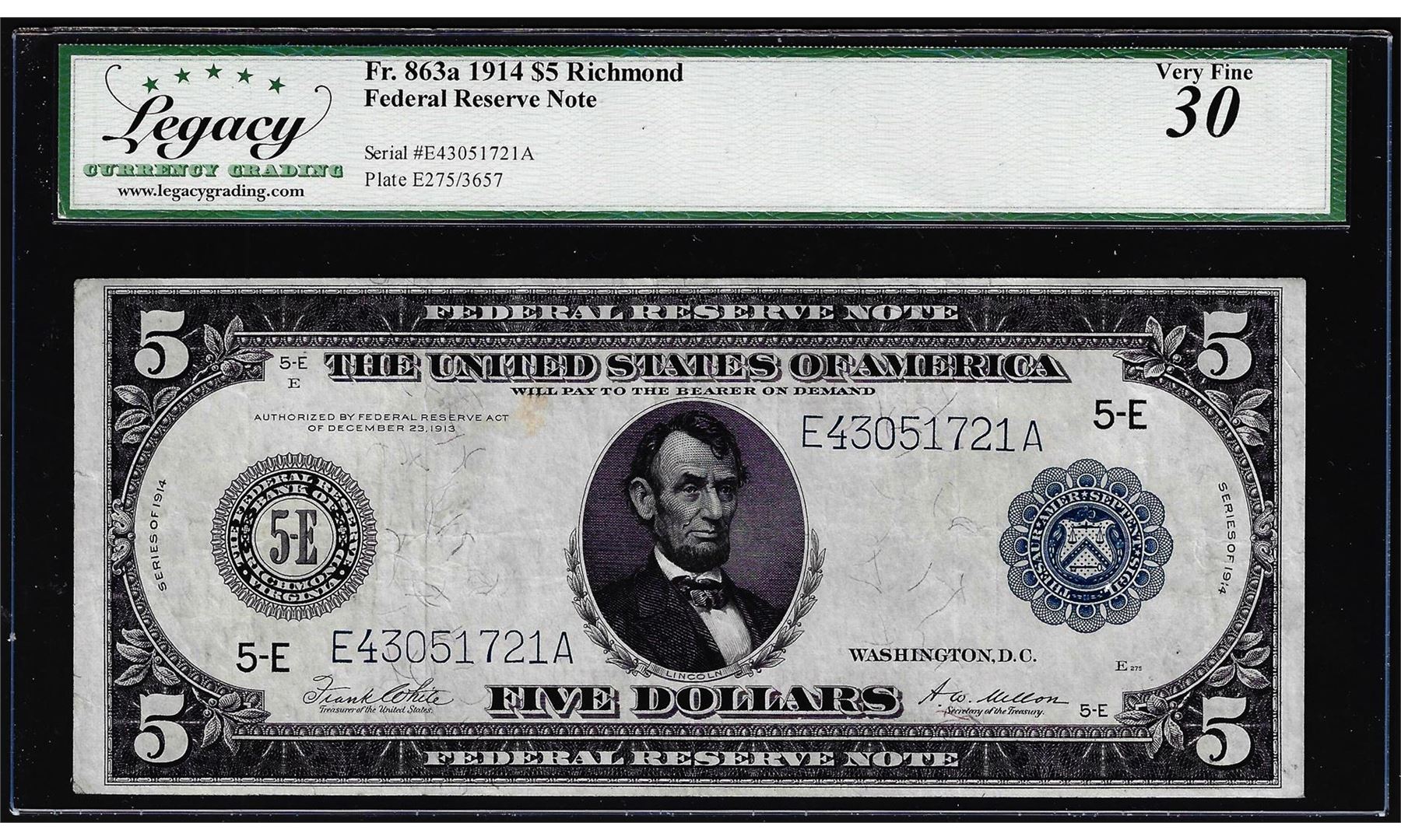 One 1914 $5 Federal Reserve Note Richmond Fr.863a Legacy Very Fine 30. Legacy Graded.