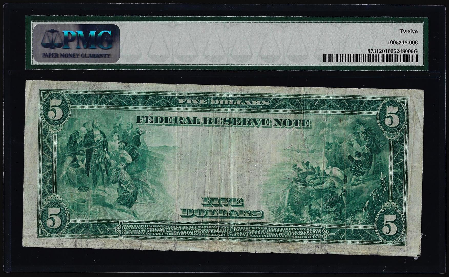 One 1914 $5 Federal Reserve Note St Louis Fr.873 PMG Fine 12. PMG Certified.