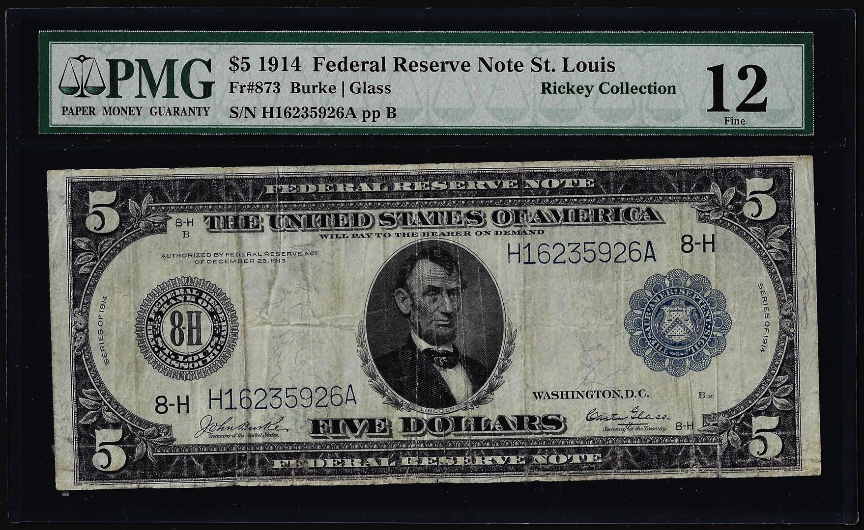 One 1914 $5 Federal Reserve Note St Louis Fr.873 PMG Fine 12. PMG Certified.