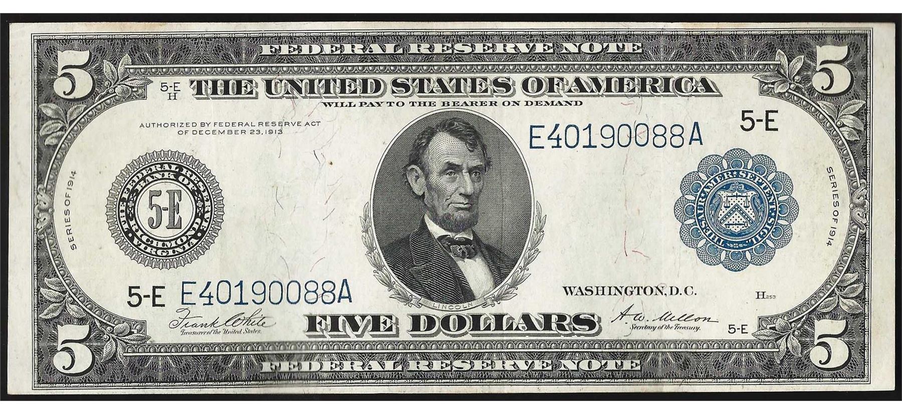 One 1914 $5 Federal Reserve Note.
