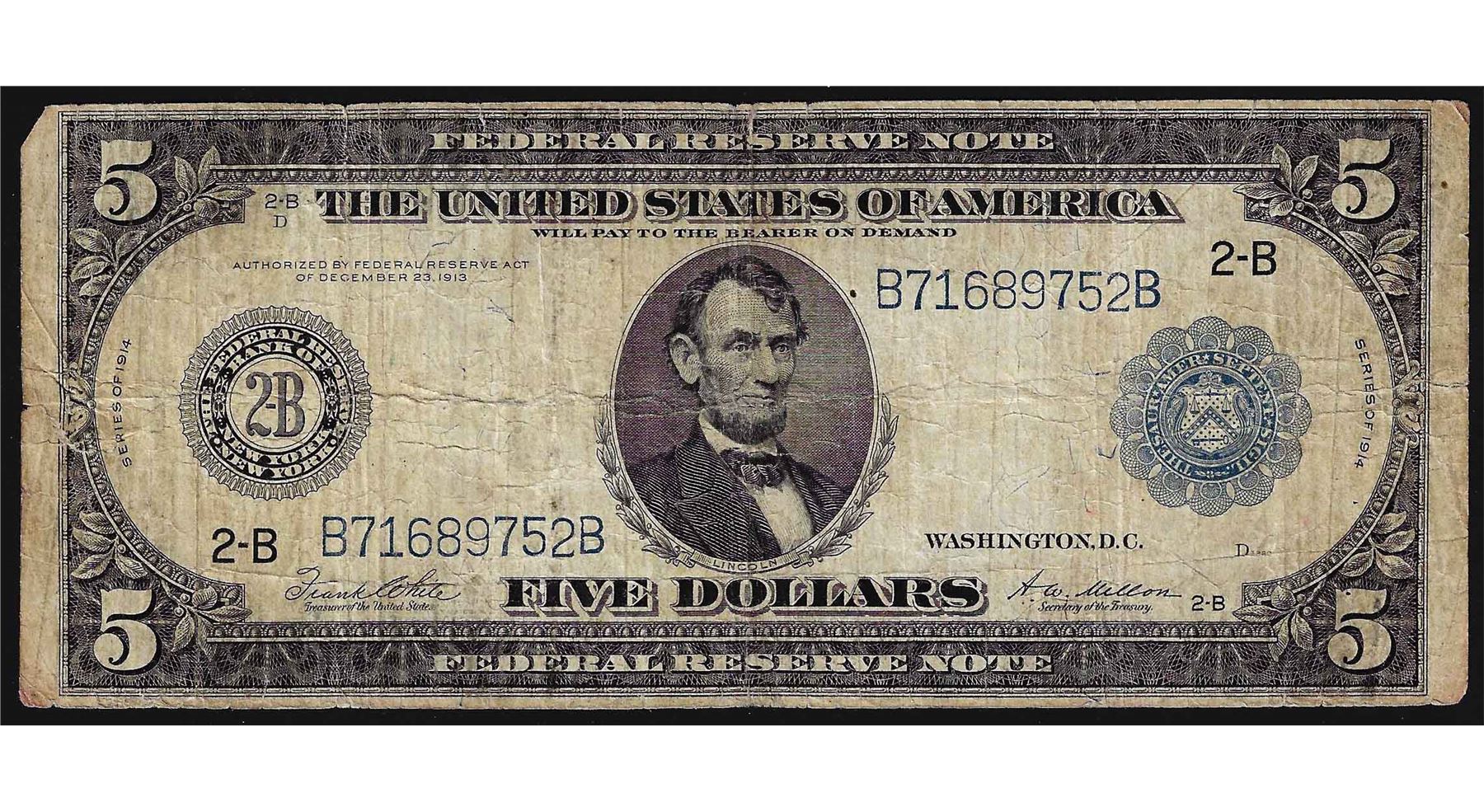 One 1914 $5 Federal Reserve Note.