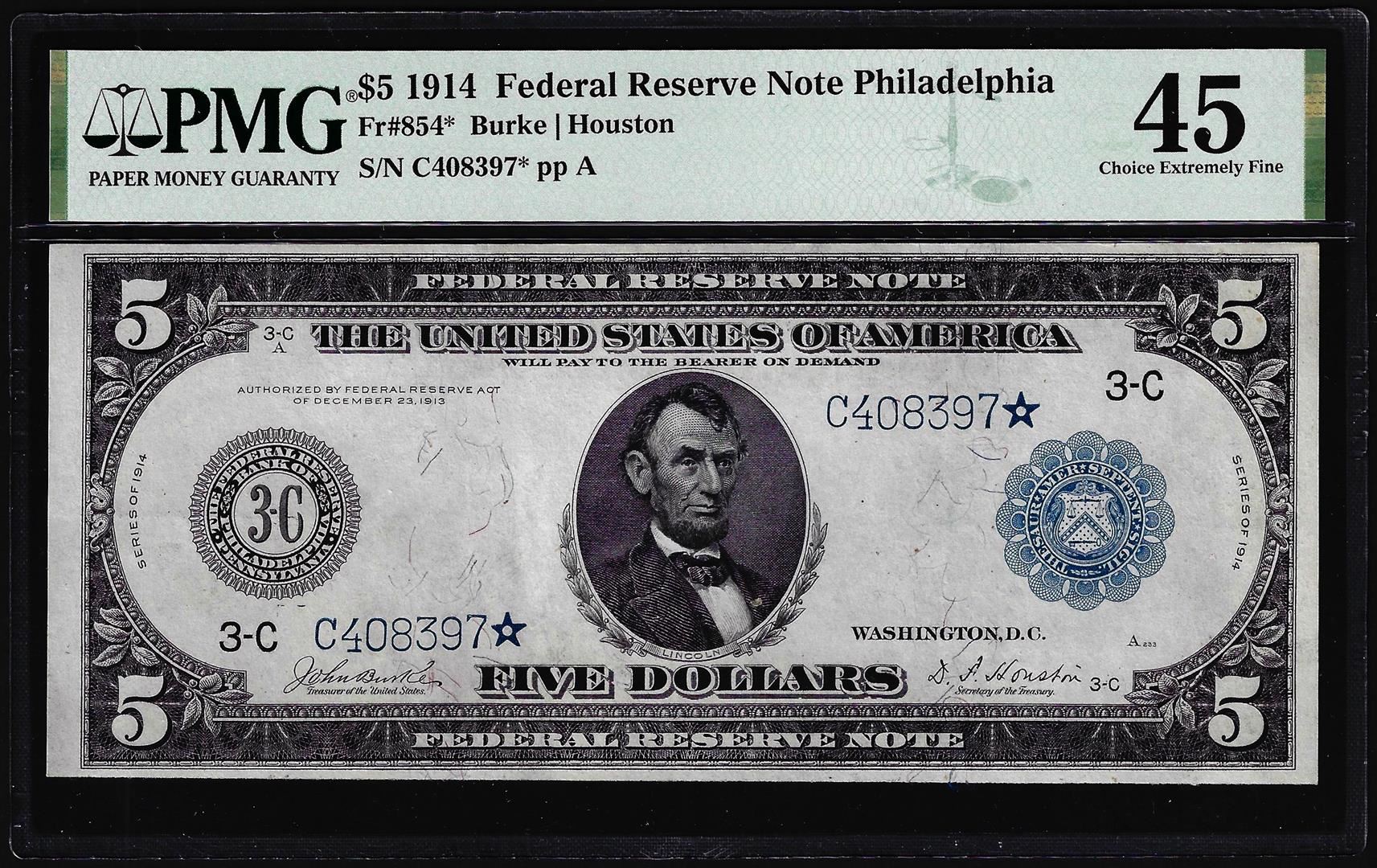 One 1914 $5 Federal Reserve Star Note Philadelphia Fr.854* PMG Choice Extremely Fine 45. PMG Certified.