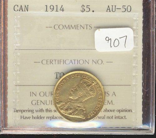 1914 $5 Gold ICCS AU50 A nice problem free example. Key date.