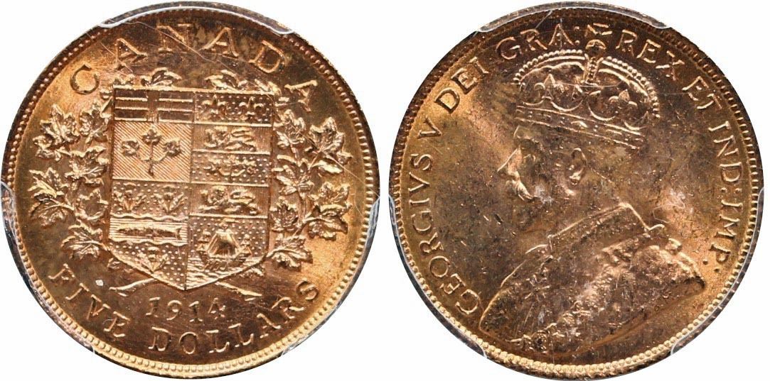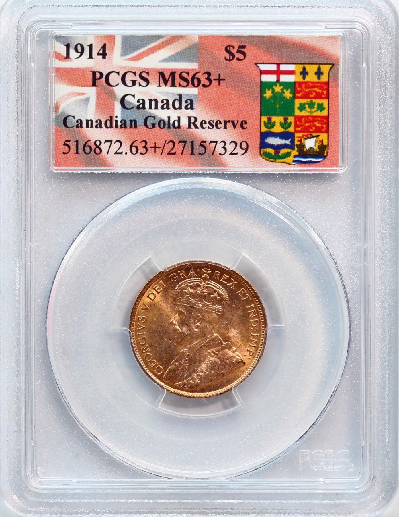 1914 $5 Gold PCGS Choice Mint State-63+. Lustrous issue from the Canadian Gold Reserve.