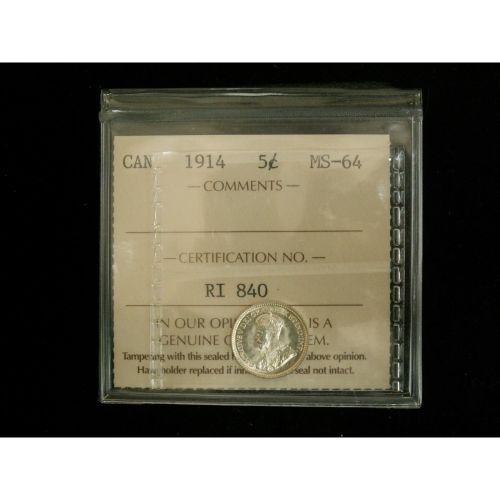 1914 5¢ ICCS MS64, Frosty white gem
