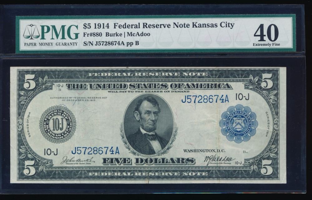 One 1914 $5 Kansas City Federal Reserve Note PMG 40.