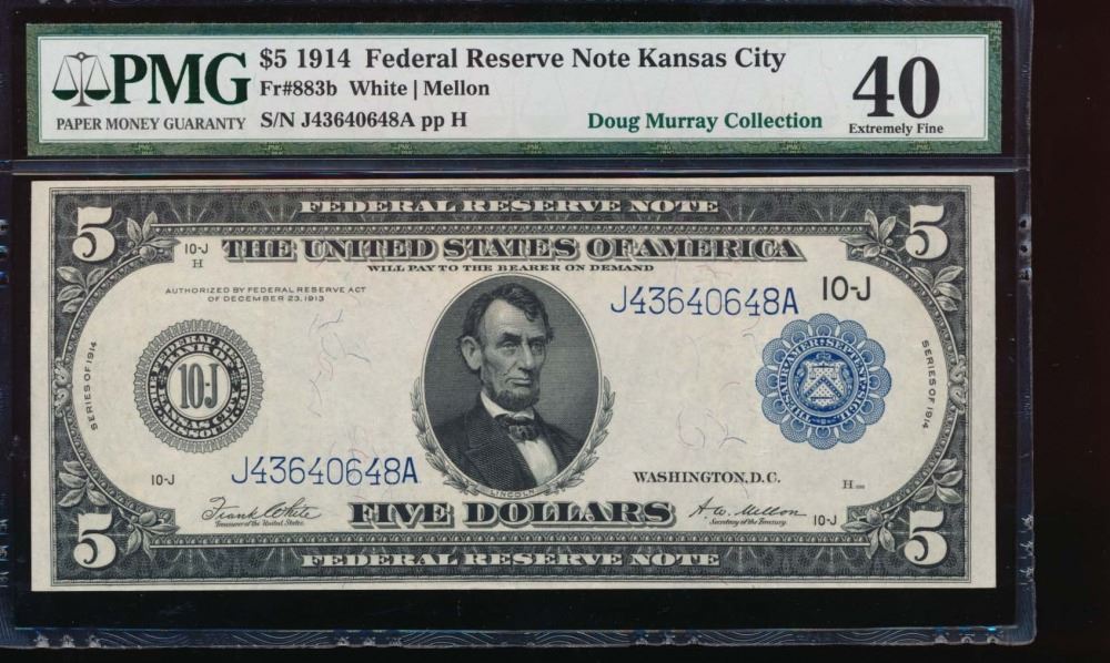 One 1914 $5 Kansas City Federal Reserve Note PMG 40.