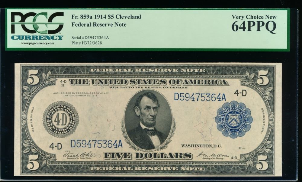 One 1914 $5 Large Cleveland Federal Reserve Note PCGS 64PPQ.