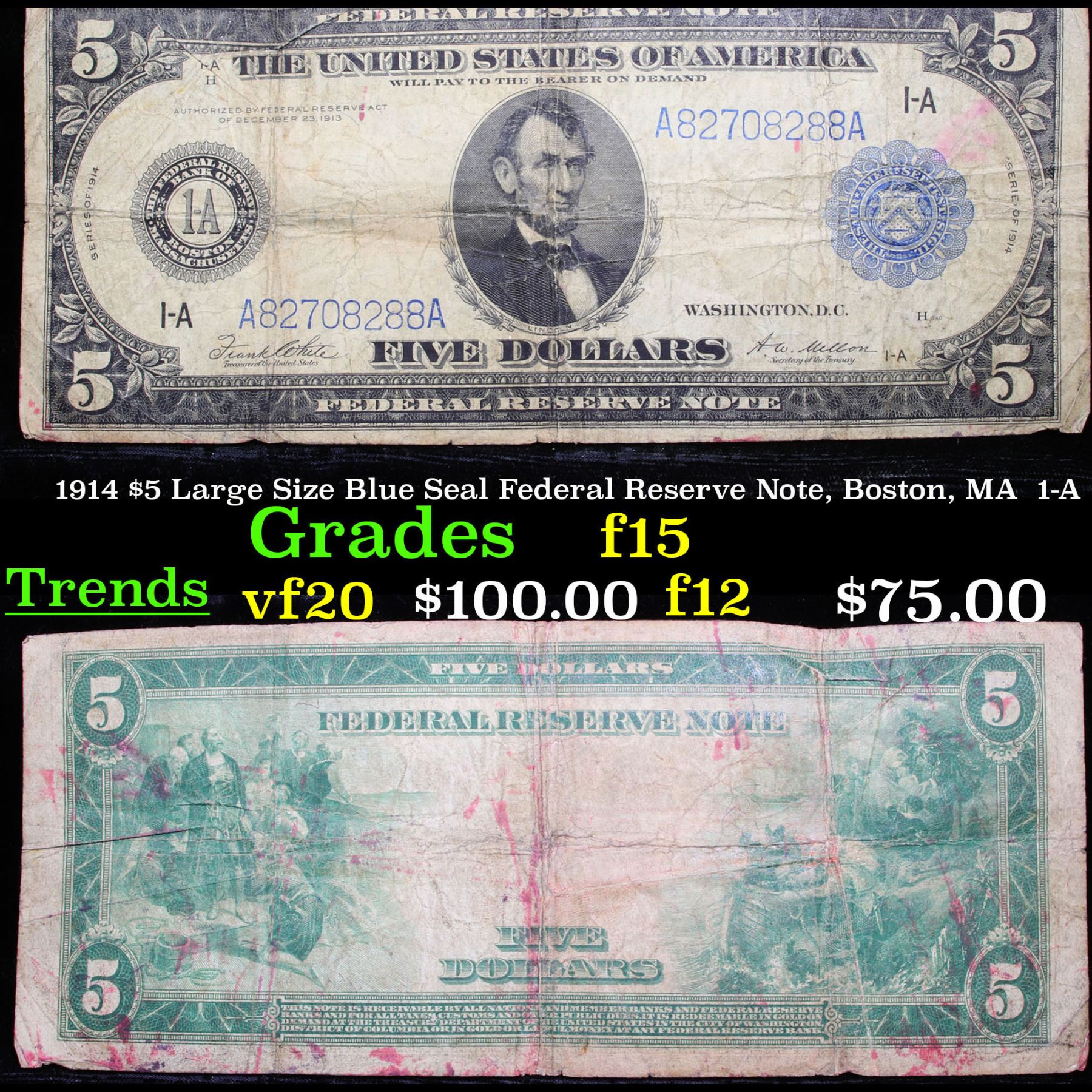 1914 $5 Large Size Blue Seal Federal Reserve Note, Boston, MA 1-A Grades f+