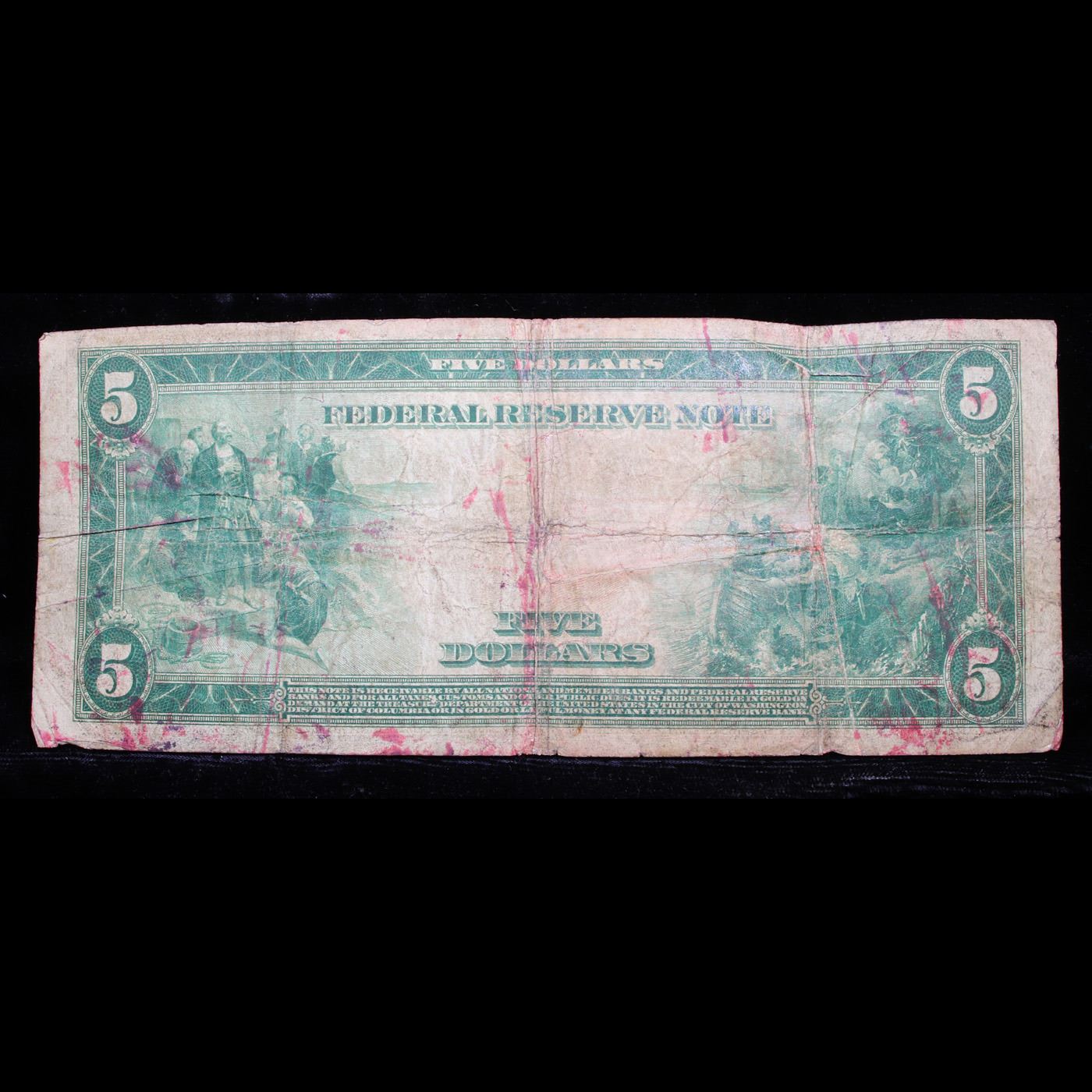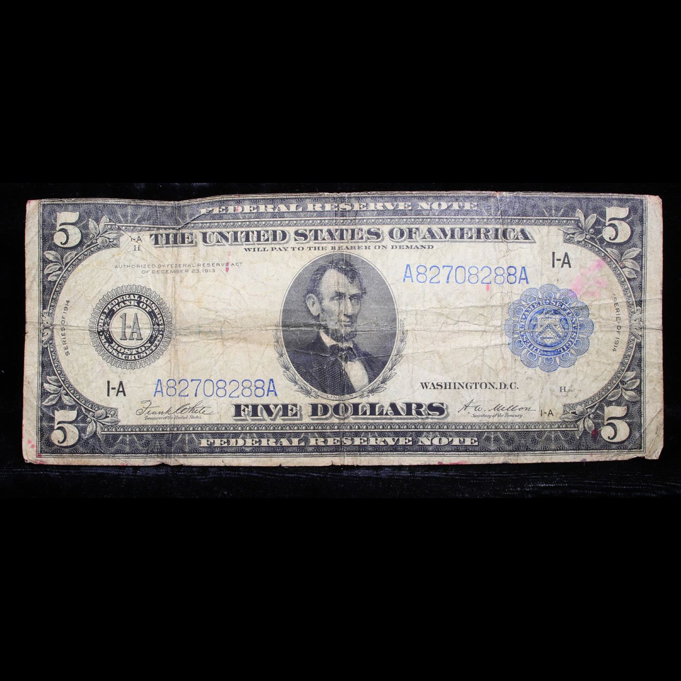 1914 $5 Large Size Blue Seal Federal Reserve Note, Boston, MA 1-A Grades f+. Despite having 1913 written on them, these are actually from the series of 1914, as it says on the right and left hands side of each note. An engraved portrait of President Abarham Lincoln is on the note's face and the back features two vignettes titled Columbus's Discovery of Land and The Landing of the Pilgrims