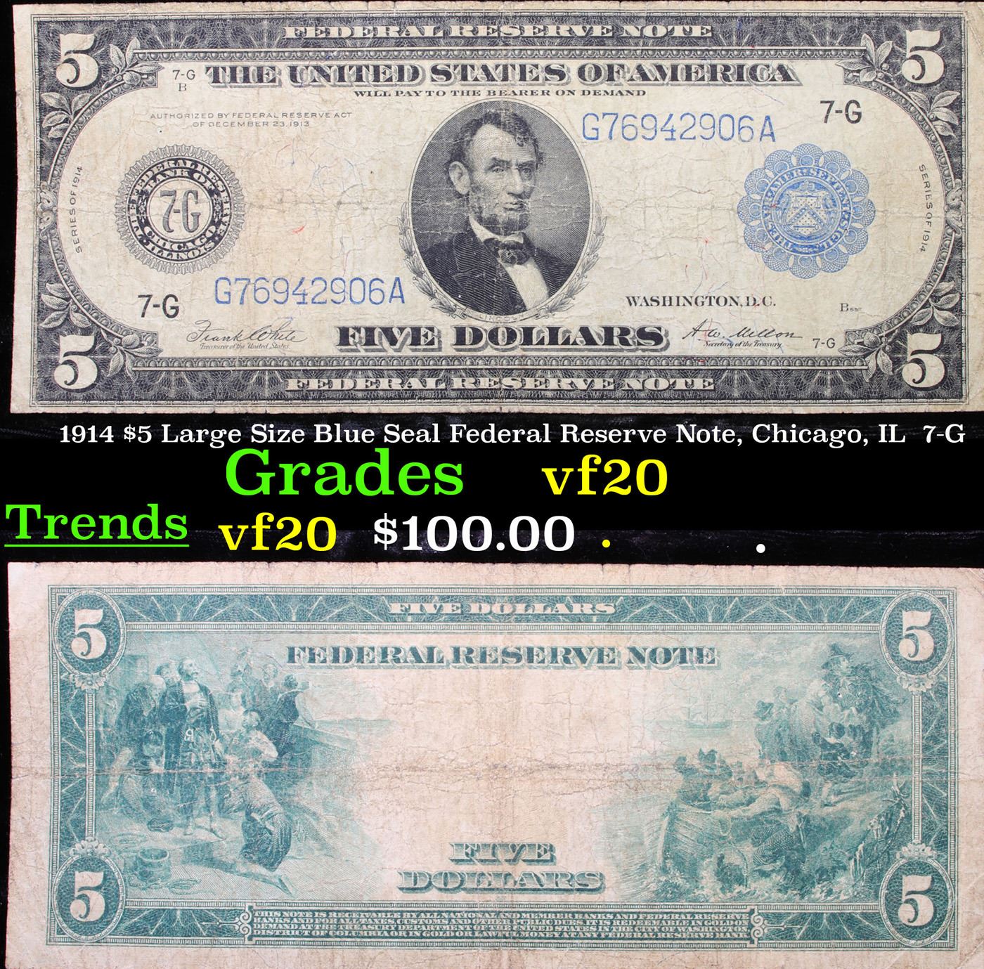 1914 $5 Large Size Blue Seal Federal Reserve Note, Chicago, IL 7-G Grades vf, very fine