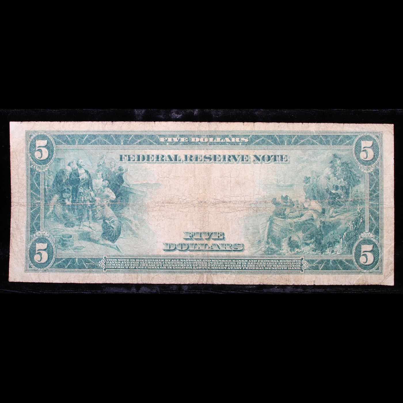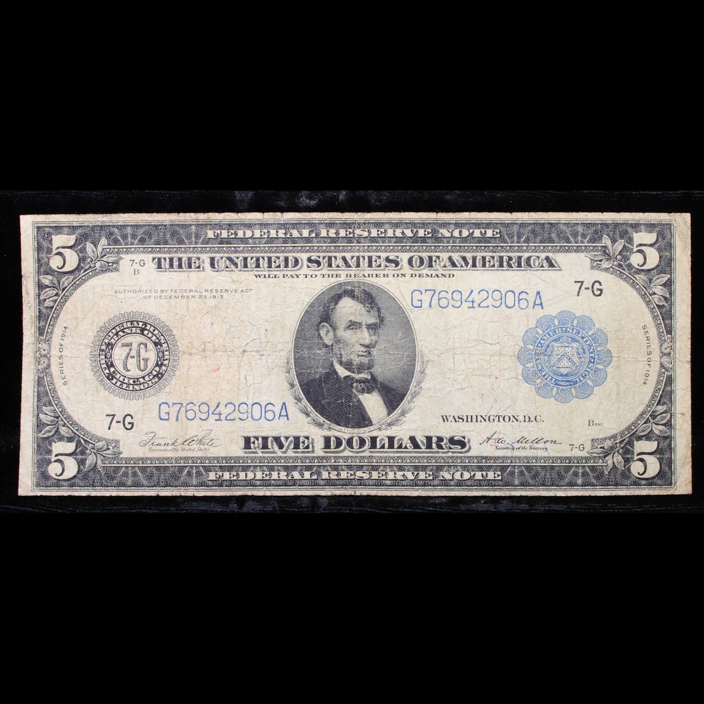 1914 $5 Large Size Blue Seal Federal Reserve Note, Chicago, IL 7-G Grades vf, very fine. Despite having 1913 written on them, these are actually from the series of 1914, as it says on the right and left hands side of each note. An engraved portrait of President Abarham Lincoln is on the note's face and the back features two vignettes titled Columbus's Discovery of Land and The Landing of the Pilgrims