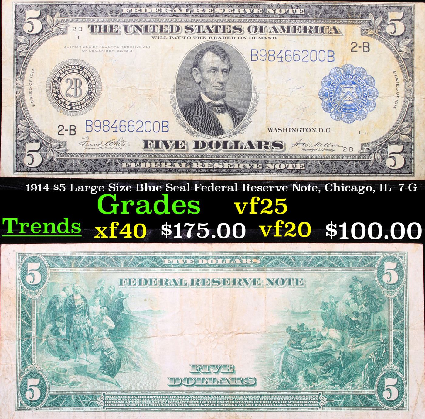 1914 $5 Large Size Blue Seal Federal Reserve Note, Chicago, IL 7-G Grades vf+