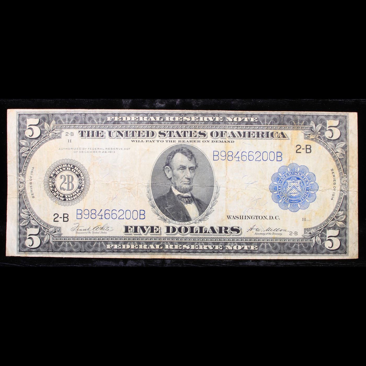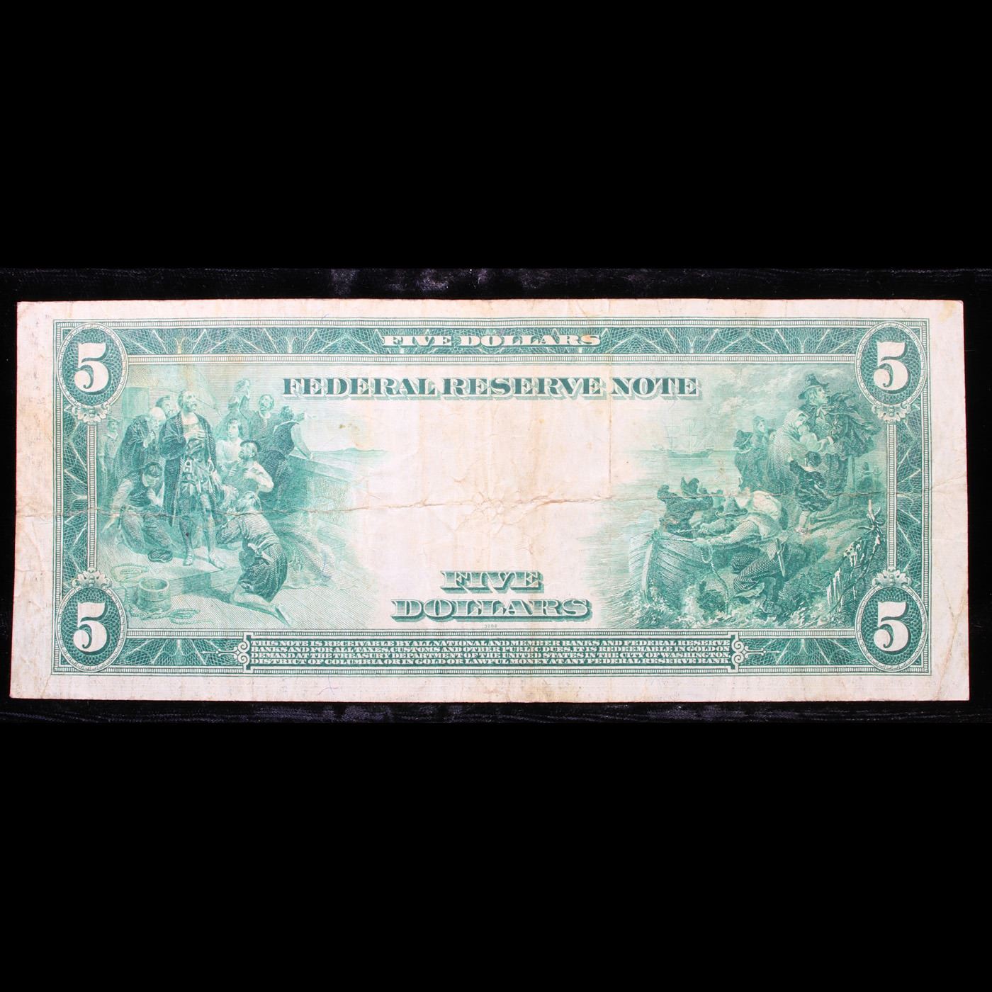 1914 $5 Large Size Blue Seal Federal Reserve Note, Chicago, IL 7-G Grades vf+. Despite having 1913 written on them, these are actually from the series of 1914, as it says on the right and left hands side of each note. An engraved portrait of President Abarham Lincoln is on the note's face and the back features two vignettes titled Columbus's Discovery of Land and The Landing of the Pilgrims