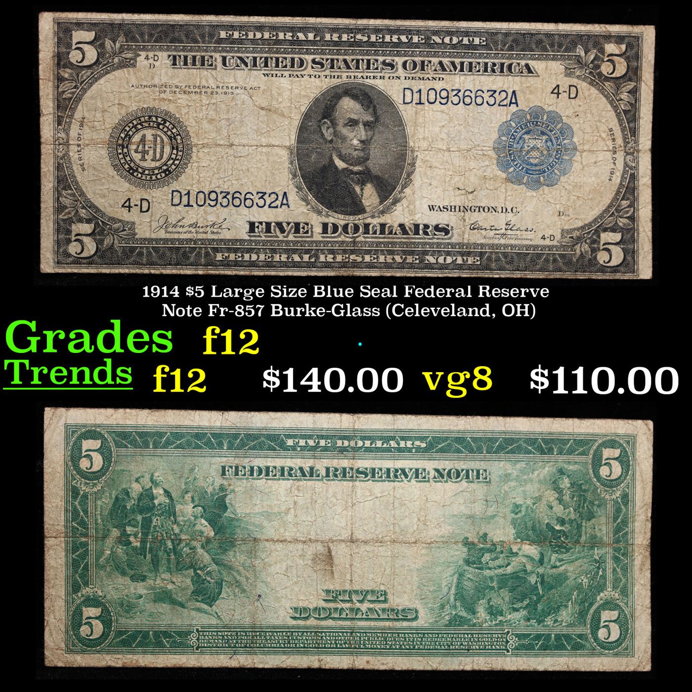 1914 $5 Large Size Blue Seal Federal Reserve Note Fr-857 Burke-Glass (Celeveland, OH) Grades f, fine