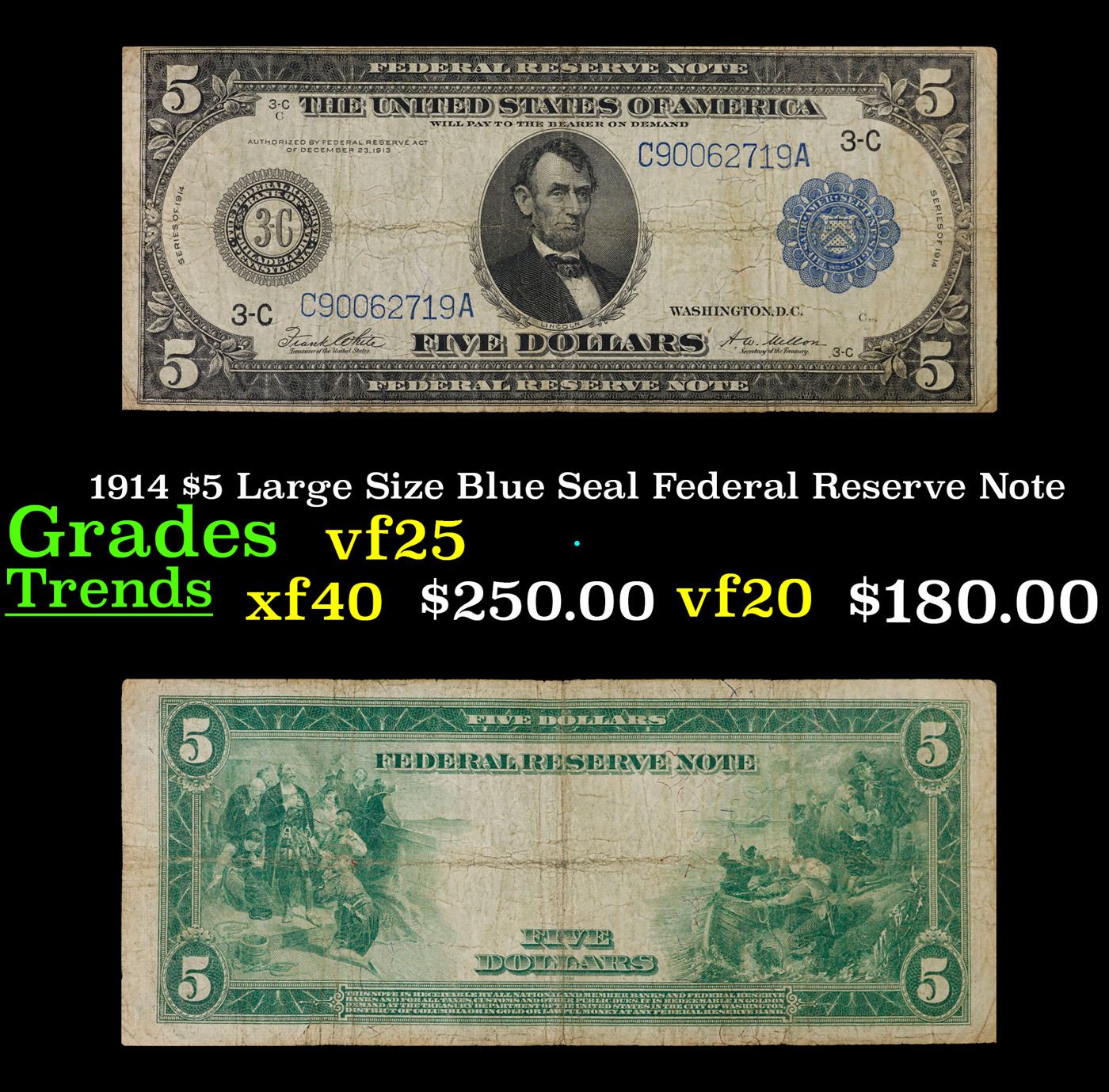 1914 $5 Large Size Blue Seal Federal Reserve Note Grades vf+.