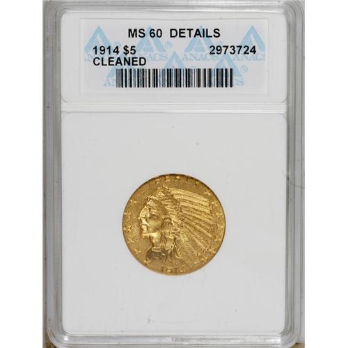 <B>1914 $5 --Cleaned--ANACS. MS60 Details.</B></I> NGC Census: (116/2880). PCGS Population (36/1181). Mintage: 247,000. Numismedia Wsl. Price for NGC/PCGS coin in MS60: $360. (#8527)<BR><BR><b>Shipping:</b> Coins & Currency (<a target="_blank" href="http://www.heritageauctions.com/common/shipping.php">view shipping information</a>)