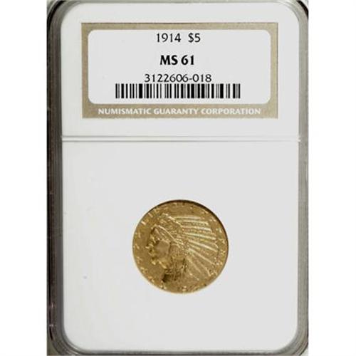 <B>1914 $5 MS61 NGC.</B></I> NGC Census: (455/1089). PCGS Population (146/1095). Mintage: 247,000. Numismedia Wsl. Price for NGC/PCGS coin in MS61: $575. (#8527)<BR><BR><B>Coin Engraver:</B> Bela Lyon Pratt<BR><BR><b>Shipping:</b> Coins & Currency (<a target="_blank" href="http://www.heritageauctions.com/common/shipping.php">view shipping information</a>)
