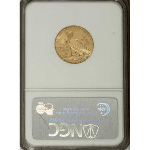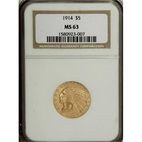 <B>1914 $5 MS63 NGC.</B></I> Good luster shows on the brass-gold surfaces of this MS63 half eagle. A well executed strike imparts sharp definition to the design elements, including the Indian's hair and headdress feathers and the eagle's plumage. A splash of light reddish color is noted near the Indian's eye. Light handling marks in the fields define the grade.<BR><BR><B>Coin Engraver:</B> Bela Lyon Pratt<BR><BR><b>Shipping:</b> Coins & Currency (<a target="_blank" href="http://www.heritageauctions.com/common/shipping.php">view shipping information</a>\)