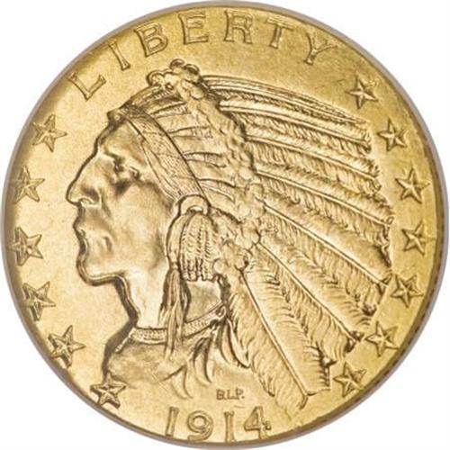<B>1914 $5 MS63 NGC.</B></I> The luster is stronger and more frosty than ordinarily seen on any Indian Head half eagle issue. This piece displays even khaki-gold coloration over each side. The obverse is blemish-free, while a few wispy marks are evident on the reverse fields, and near the reverse motto. This date has the lowest mintage of any Philadelphia Mint issue, for the type. <BR><BR><B>Coin Engraver:</B> Bela Lyon Pratt<BR><BR><b>Shipping:</b> Coins & Currency (<a target="_blank" href="http://www.heritageauctions.com/common/shipping.php">view shipping information</a>)