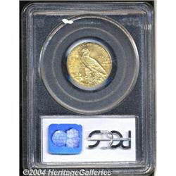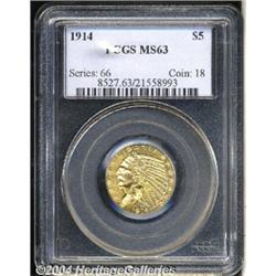 <B>1914<$5> MS63 PCGS.</B></I> Sharply defined and fully lustrous. The original yellow-gold color looks great with only a few abrasions. <BR><BR><B>Important notice:</B> Heritage usually auctions material at the rate of 200-250 lots per hour. On some occasions eBay Live bid software or the Internet may not be able to keep up with the pace of the auction. We recommend placing a realistic absentee bid now as insurance to avoid disappointment. Occasionally the auctioneer may eliminate or reject an eBay Live bid, and the auctioneer may also reopen a lot after the close of the eBay live bidding (usually because we missed an audience bid), and may reject your bid even if it shows you as the winning bidder. By bidding via eBay Live, you agree that Heritage may award the lot to another bidder at its sole discretion under the circumstances described above or any other reasonable circumstances. Since eBay bids are not shown to us until we open the lot on the floor, we treat those bids just like floor bids. In most cases the floor responds before the eBay bid is presented to us, due to Internet lag time, so for consistency we have made it a policy that floor bids are always considered first over tie eBay live bids. Also please note that all Heritage lots purchased through eBay Live carry a 20% Buyer's Premium. Please make sure you read the Terms and Conditions before you bid.