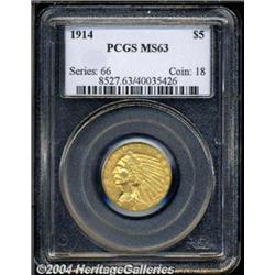 <B>1914<$5> MS63 PCGS.</B></I> A very pleasing type coin that has soft, frosted luster and is sharply defined throughout. A couple of minor abrasions show on the reverse. <BR><BR><B>Important notice:</B> Heritage usually auctions material at the rate of 200-250 lots per hour. On some occasions eBay Live bid software or the Internet may not be able to keep up with the pace of the auction. We recommend placing a realistic absentee bid now as insurance to avoid disappointment. Occasionally the auctioneer may eliminate or reject an eBay Live bid, and the auctioneer may also reopen a lot after the close of the eBay live bidding (usually because we missed an audience bid), and may reject your bid even if it shows you as the winning bidder. By bidding via eBay Live, you agree that Heritage may award the lot to another bidder at its sole discretion under the circumstances described above or any other reasonable circumstances. Since eBay bids are not shown to us until we open the lot on the floor, we treat those bids just like floor bids. In most cases the floor responds before the eBay bid is presented to us, due to Internet lag time, so for consistency we have made it a policy that floor bids are always considered first over tie eBay live bids. Also please note that all Heritage lots purchased through eBay Live carry a 20% Buyer's Premium. Please make sure you read the Terms and Conditions before you bid.