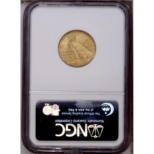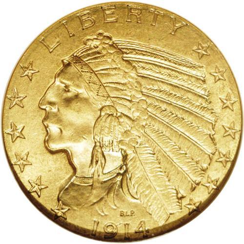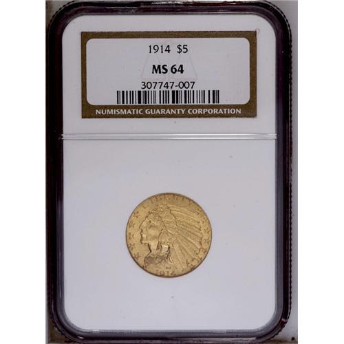 <B>1914<$5> MS64 NGC.</B></I> Another popular choice for a type coin in this string of near-Gem coins, this one from the year that saw the assassination of Austrian Archduke Franz Ferdinand by the Serbian nationalist Gavrilo Princip, the event that immediately precipitated World War I. This lovely example has choice copper-gold coloration, satiny luster, and only a couple of small abrasions on the Indian's jawbone. NGC has graded 13 pieces finer (3/06). <BR><BR><B>Important notice:</B> Heritage usually auctions material at the rate of 200-250 lots per hour. On some occasions eBay Live bid software or the Internet may not be able to keep up with the pace of the auction. We recommend placing a realistic absentee bid now as insurance to avoid disappointment. Occasionally the auctioneer may eliminate or reject an eBay Live bid, and the auctioneer may also reopen a lot after the close of the eBay live bidding (usually because we missed an audience bid), and may reject your bid even if it shows you as the winning bidder. By bidding via eBay Live, you agree that Heritage may award the lot to another bidder at its sole discretion under the circumstances described above or any other reasonable circumstances. Since eBay bids are not shown to us until we open the lot on the floor, we treat those bids just like floor bids. In most cases the floor responds before the eBay bid is presented to us, due to Internet lag time, so for consistency we have made it a policy that floor bids are always considered first over tie eBay live bids. Also please note that all Heritage lots purchased through eBay Live carry a 20% Buyer's Premium. Please make sure you read the Terms and Conditions before you bid. This lot is being auctioned in conjunction with a live floor auction by Heritage Galleries & Auctioneers. All final auction and invoice information will be supplied by Heritage Galleries & Auctioneers, and all other information should be considered preliminary. Lot:2897 <BR><BR><B>Winning Notification and Billing:</B> After the FINAL session in this auction is complete, Heritage will send e-mail and snail mail invoices. This process normally takes several days. All final auction and invoice information will be supplied by Heritage Galleries & Auctioneers, and all other information should be considered preliminary. <BR><BR>This auction will be conducted on a live auction floor and over the Internet through eBay Live. If you choose to place an absentee bid, please take a moment to <font color='#0000ff'><u><a href='http://pages.ebay.com/liveauctions/help/before/laabsentee.html'>learn how eBay Live absentee bidding works</a></u></font><font color='#000000'>