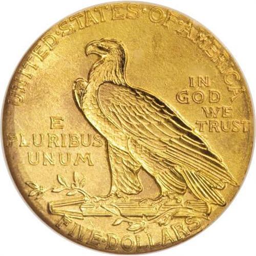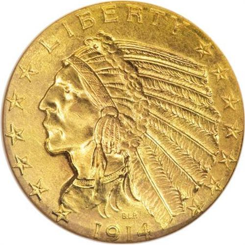 <B>1914 $5 MS64 NGC.</B></I> This piece is perhaps only one tiny tick on the Indian's cheek away from a finer grade, as the surfaces are relatively mark-free, and the headstrong luster is compelling in its radiance. The strike is well, if not fully executed, and the combination is altogether pleasing. Seldom seen finer: NGC has certified only 15 pieces in higher grades (6/07).<BR><BR><b>Shipping:</b> Coins & Currency (<a target="_blank" href="http://www.heritageauctions.com/common/shipping.php">view shipping information</a>)
