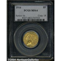 <B>1914<$5> MS64 PCGS.</B></I> A shimmering chestnut-gold near-Gem that has an undisturbed obverse and only a few unimportant luster grazes in the reverse field. Boldly struck except for a hint of softness on portions of the lower half of the Indian's headdress. Although often regarded as a type coin, the 1914 has the lowest Philadelphia Mint production of the series. <BR><BR><B>Important notice:</B> Heritage usually auctions material at the rate of 200-250 lots per hour. On some occasions eBay Live bid software or the Internet may not be able to keep up with the pace of the auction. We recommend placing a realistic absentee bid now as insurance to avoid disappointment. Occasionally the auctioneer may eliminate or reject an eBay Live bid, and the auctioneer may also reopen a lot after the close of the eBay live bidding (usually because we missed an audience bid), and may reject your bid even if it shows you as the winning bidder. By bidding via eBay Live, you agree that Heritage may award the lot to another bidder at its sole discretion under the circumstances described above or any other reasonable circumstances. Since eBay bids are not shown to us until we open the lot on the floor, we treat those bids just like floor bids. In most cases the floor responds before the eBay bid is presented to us, due to Internet lag time, so for consistency we have made it a policy that floor bids are always considered first over tie eBay live bids. Also please note that all Heritage lots purchased through eBay Live carry a 20% Buyer's Premium. Please make sure you read the Terms and Conditions before you bid. </span></font></tr></table></td></tr></table>