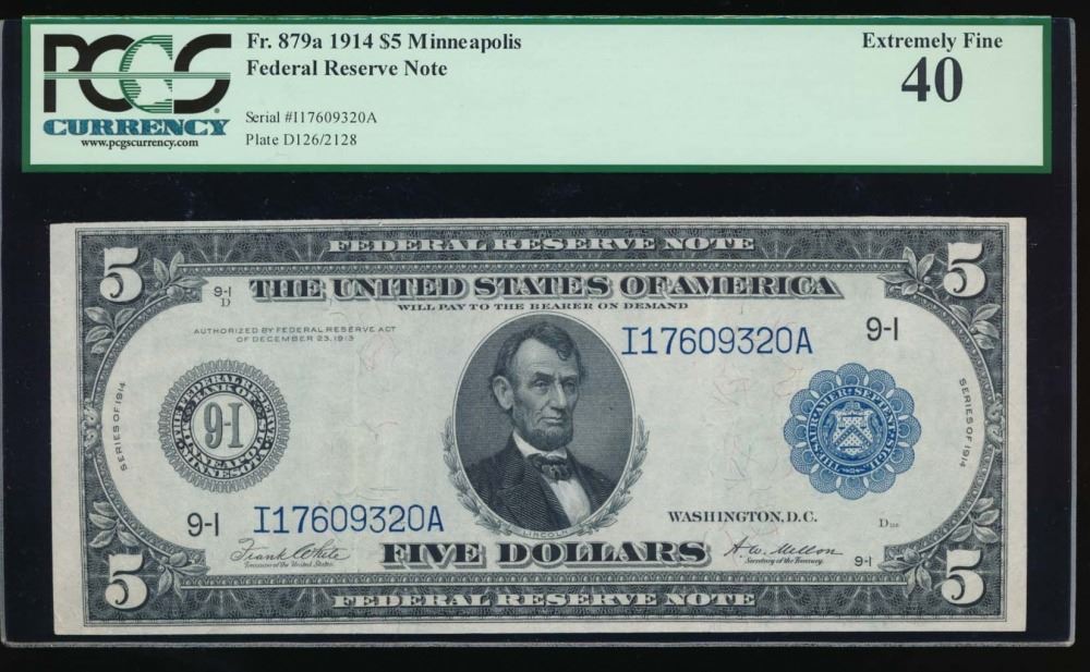 One 1914 $5 Minneapolis Federal Reserve Note PCGS 40.